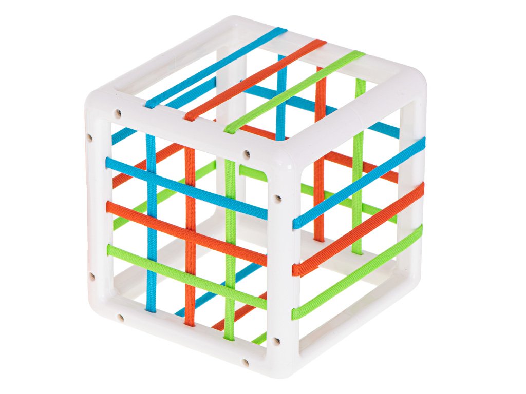 Provlečení kostky přes gumičky může být zpočátku dost složitý úkol! Bude si vyžadovat přemýšlení, kombinování a hledání kreativních řešení na úrovni vhodné pro miminko!
