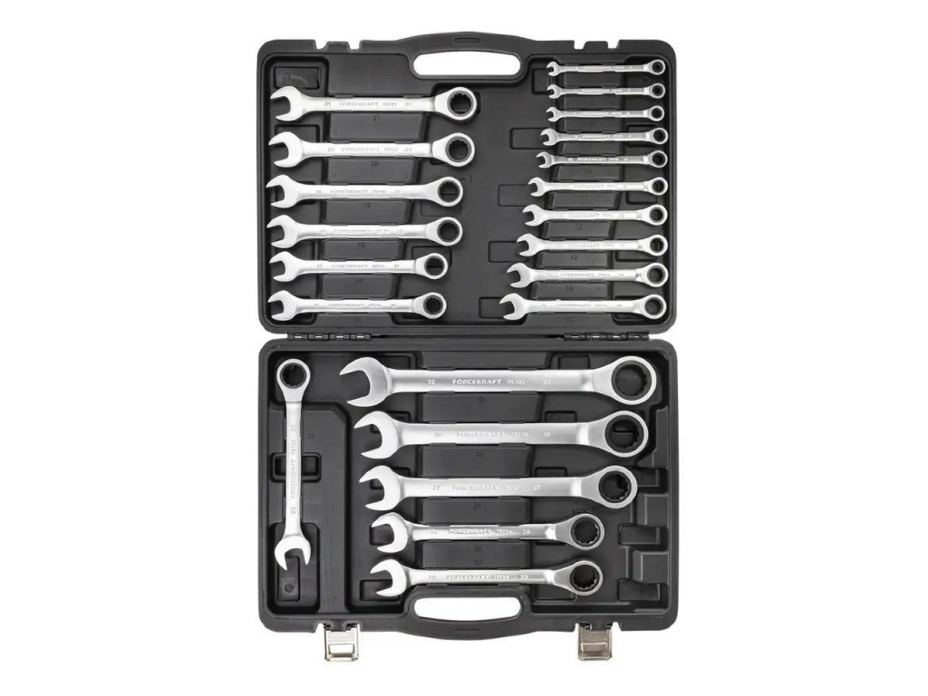 Sada obsahuje až 22 plochých očkových klíčů v rozmezí od 6 do 32 mm, což umožňuje pohodlné vykonávání většiny mechanických a servisních prací – od drobných domácích oprav, přes práci při technických instalacích, až po profesionální automobilový či průmyslový servis.