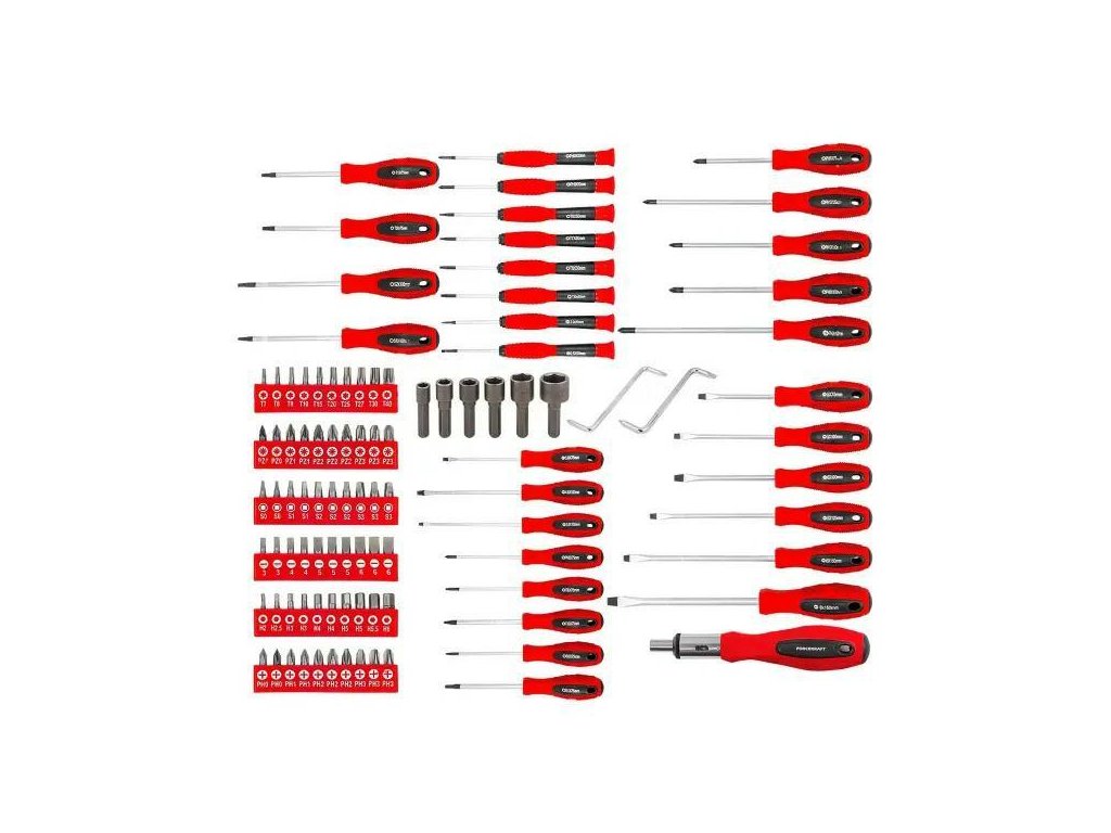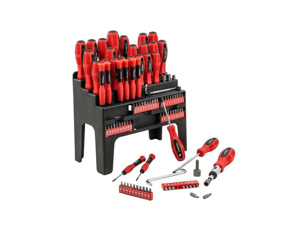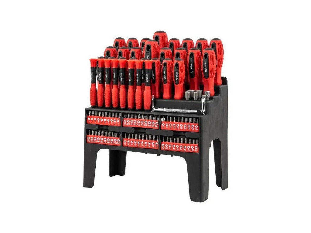 Sada obsahuje ploché, křížové, Torx, čtvercové šroubováky a širokou škálu bitů a nástrček. Díky tomu sada pokrývá téměř všechny nejčastěji používané typy šroubů a vrutů.