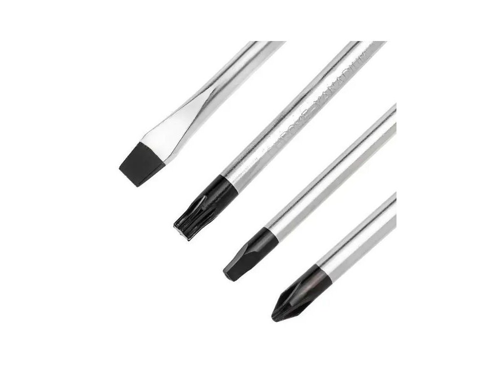 Jádrové šroubováky a bity jsou vyrobeny z tvrdé chromovo-vanadové oceli (Cr-V), která se vyznačuje odolností vůči opotřebení a deformacím. Tento materiál zaručuje dlouhověkost nářadí i při intenzivním používání.