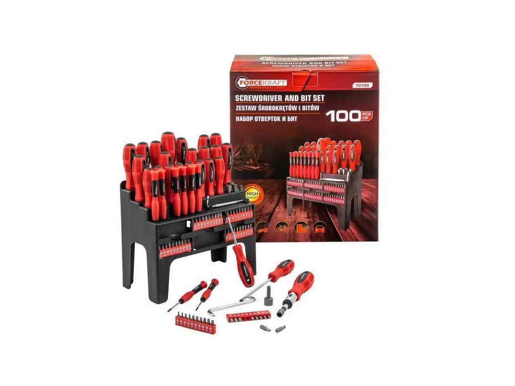 Sada šroubováků a bitů 100 prvků značky Forcekraft je univerzálním řešením pro kutily, servisní techniky a profesionály, kteří potřebují široký sortiment nářadí na práci s různými typy a velikostmi spojovacích prvků. Obsahuje bohatou sadu šroubováků, bitů, nástrčných koncovek a úchytů, což z něj dělá kompletní vybavení jak pro dílnu, garáž, tak i pro domácí použití.