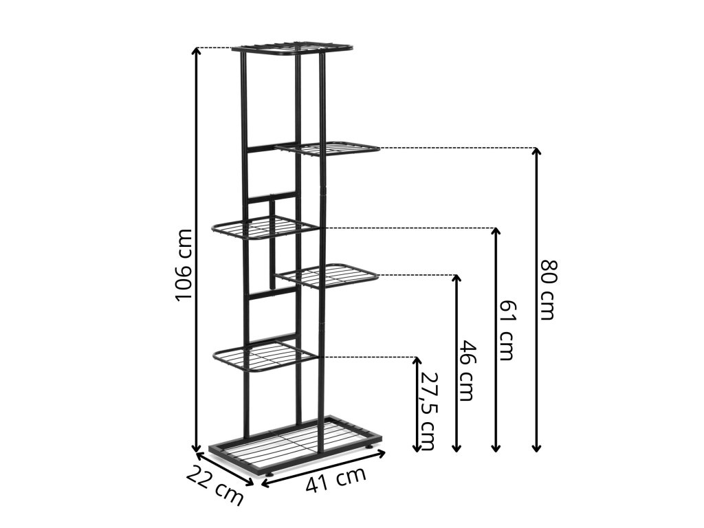 - Výška polic nad zemí: přibližně 0.5 / 27.5 / 46 / 61 / 80 / 106 cm