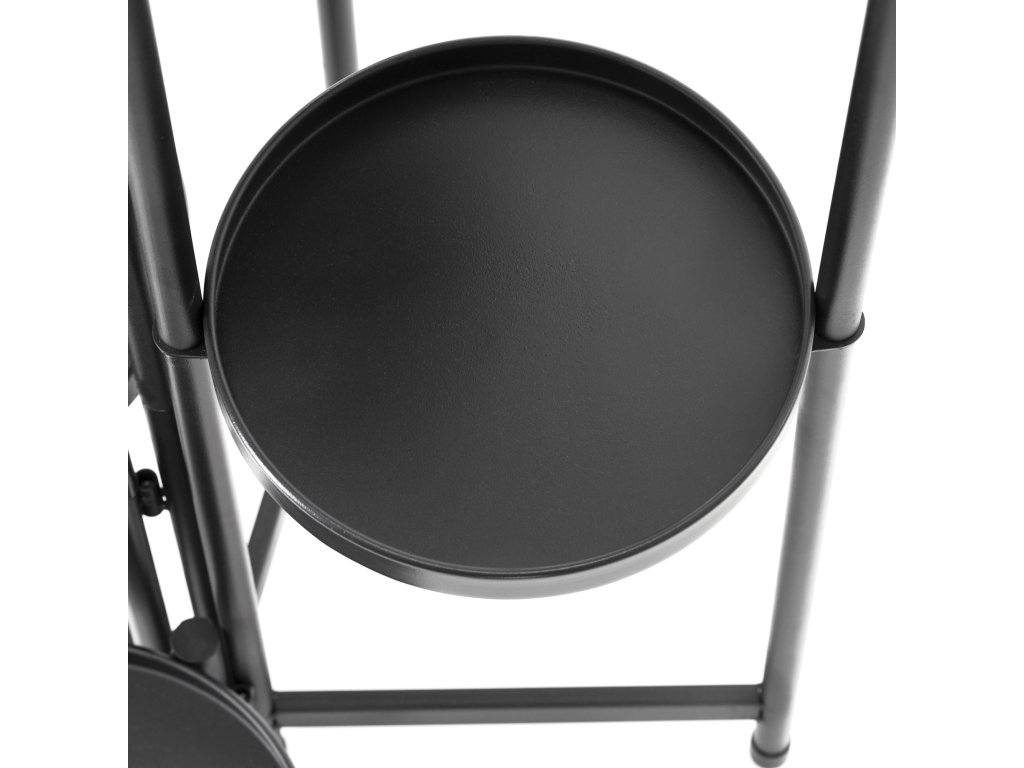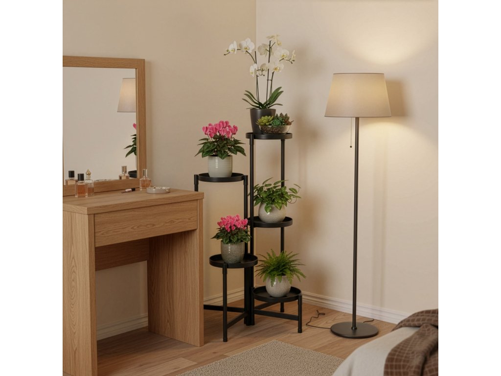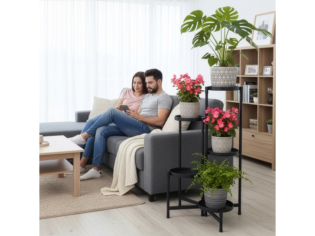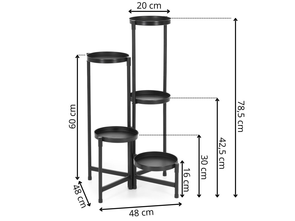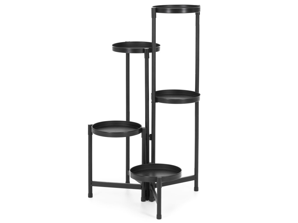 - Kovový skládací stojan na květiny bez použití šroubů – prvky a police jsou sestaveny jednoduchým překrytím