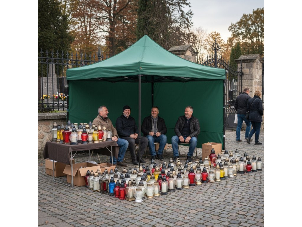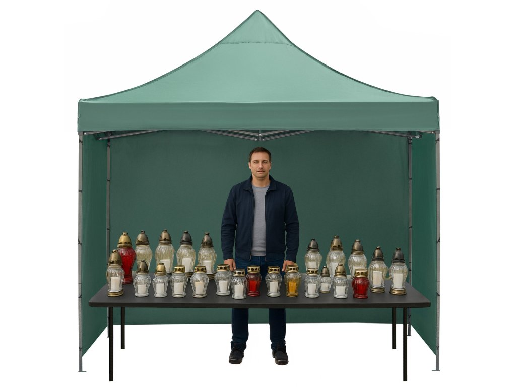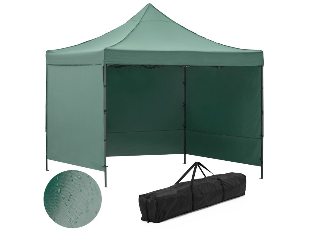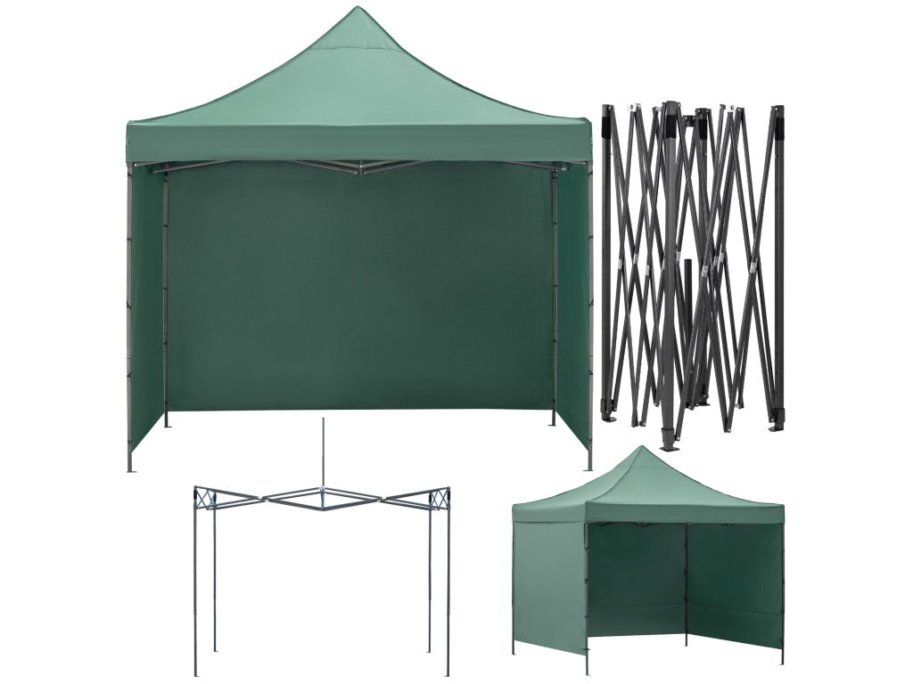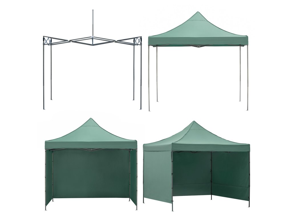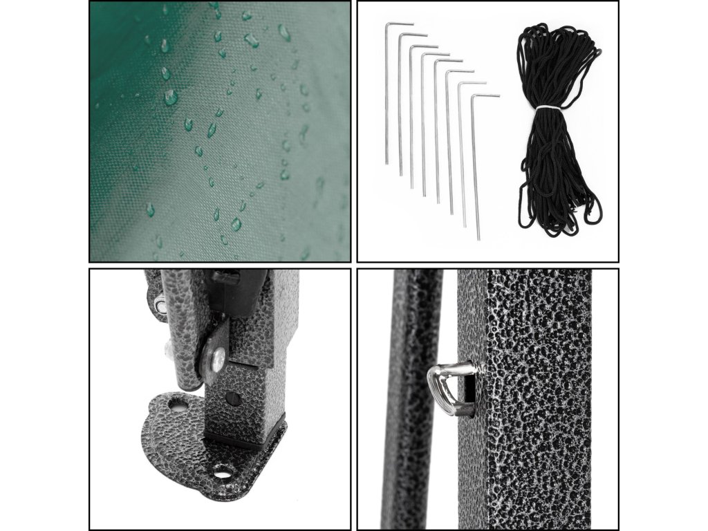 - V sadě: střecha, 3 x stěna 3 m, rám, obal s rukojetí na zip, 8 kolíků a 4 provázky, návod