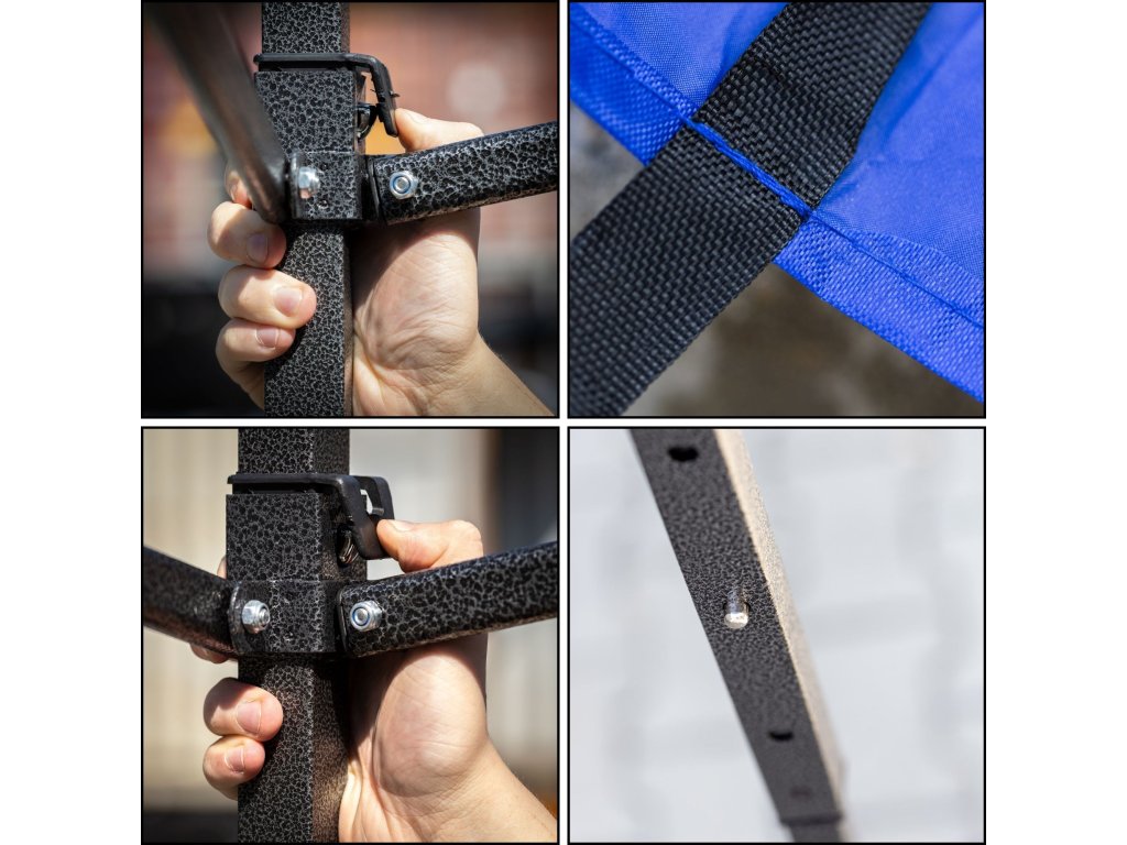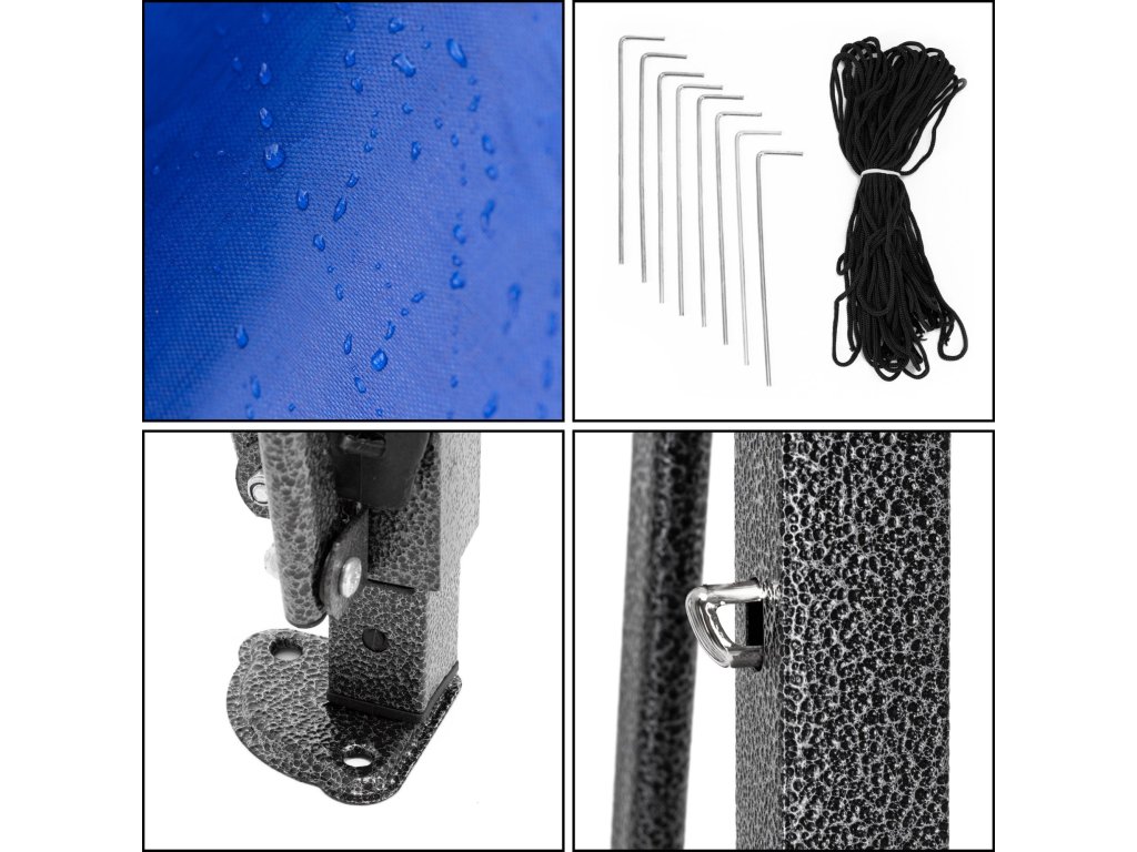Rám je potažen antikorozní vrstvouV sadě: střecha, 3 x stěna 3 m, rám, obal s držadly uzavíratelný na zip, 8 kolíků a 4 lana, návod