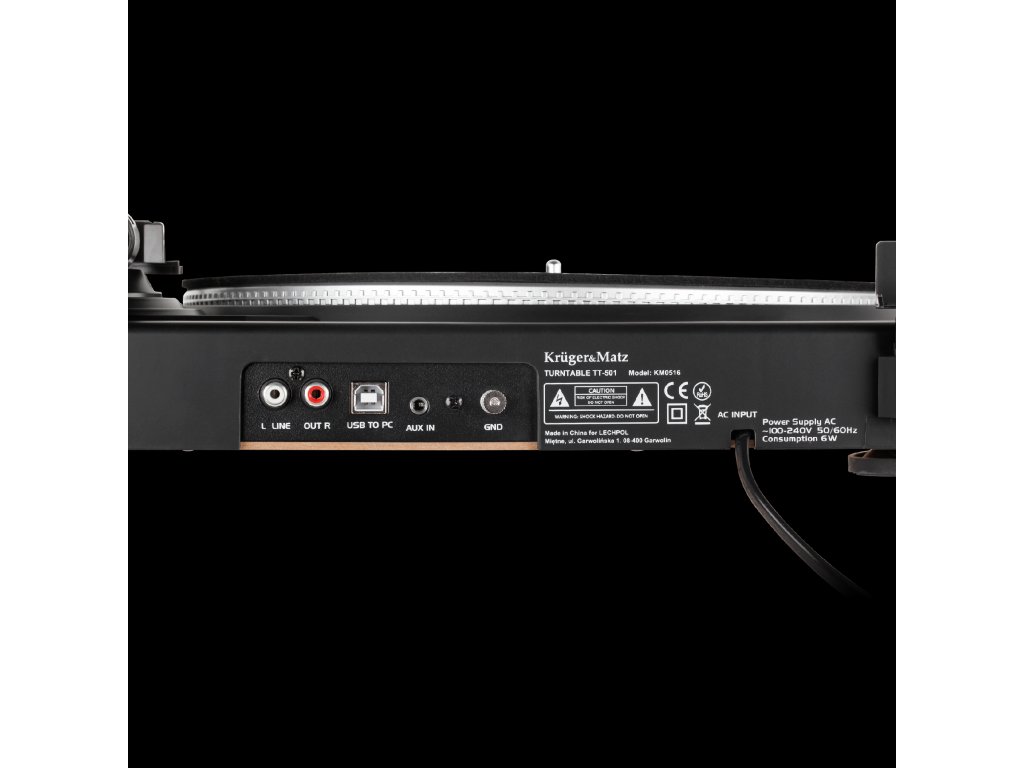 Moderní gramofon Kruger&Matz s řemínkovým pohonem umožňuje přehrávání desek ve dvou rychlostech: 33 ot./min. a 45 ot./min. Toto řešení umožňuje zařízení snadno zvládnout hudbu zaznamenanou jak na starých vinylových deskách, tak i na těch modernějších.