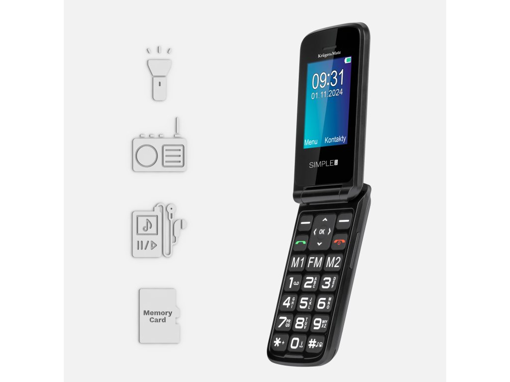 Mobil pro seniory Simple 931 nabízí praktické každodenní funkce. Vestavěná baterka poskytne světlo v každé situaci, FM rádio zpříjemní čas oblíbenými pořady a přehrávač MP3 umožní přehrávat hudbu. Slot na kartu microSD podporující až 32 GB paměti umožňuje ukládat fotografie, hudbu či dokumenty, což výrazně zvyšuje funkčnost zařízení.