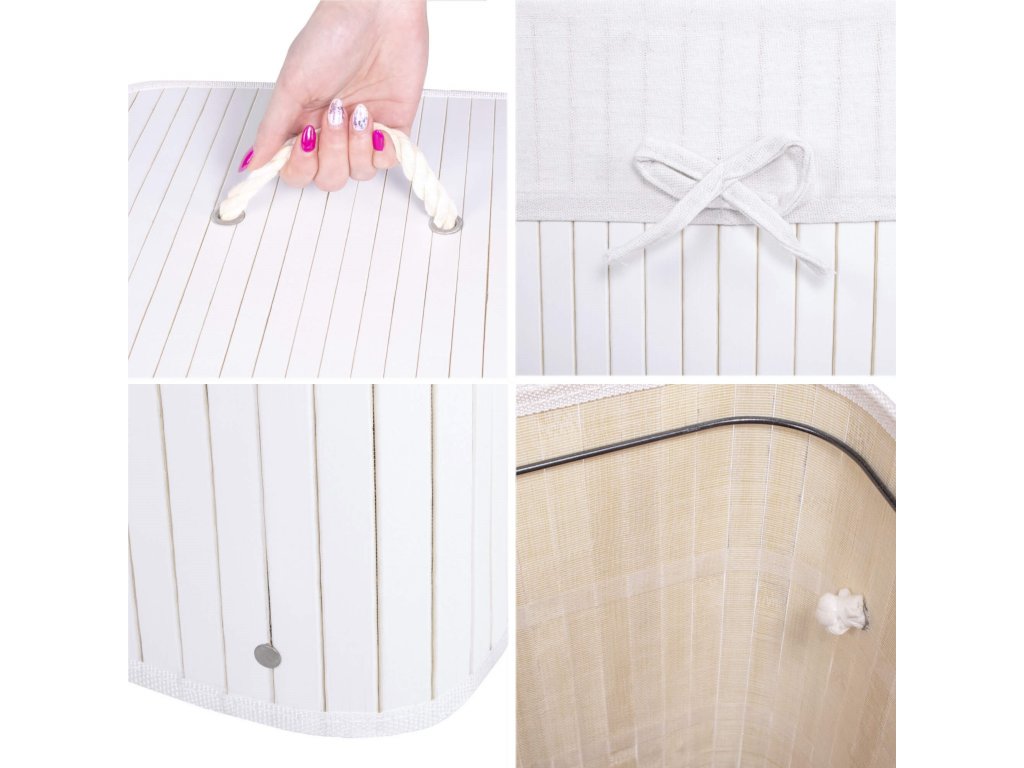 - Prvky v sadě (5 el.): bambusové tělo, dno z MDF, horní výztuž z kovového drátu, vnitřek z textilie, bambusové víko