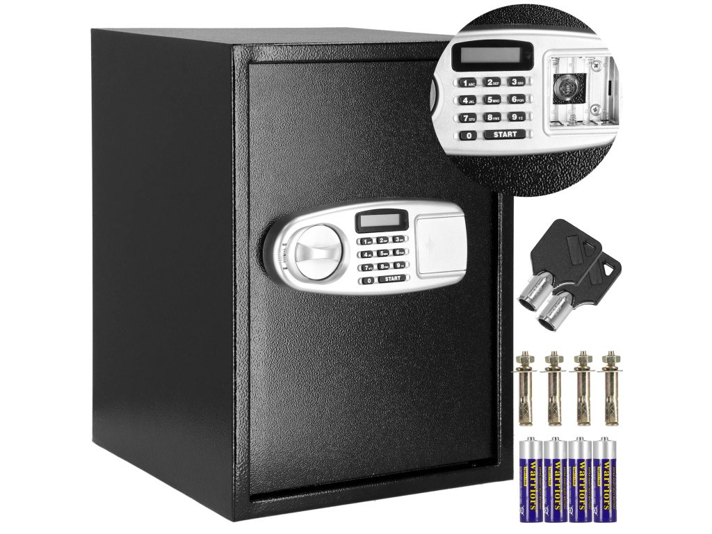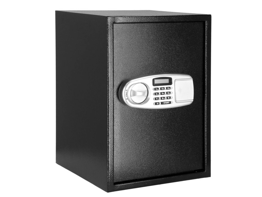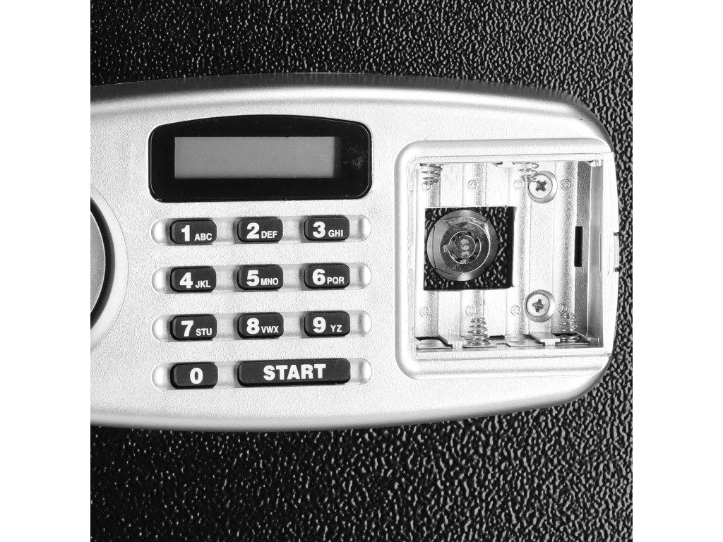 Navíc: možnost upevnění na stěny, podlahu a skříně (hmoždinky v balení), vyjímatelná police uvnitř, filcová podložka tlumící interiér sejfu