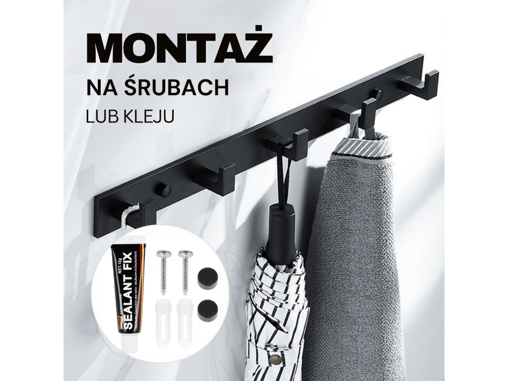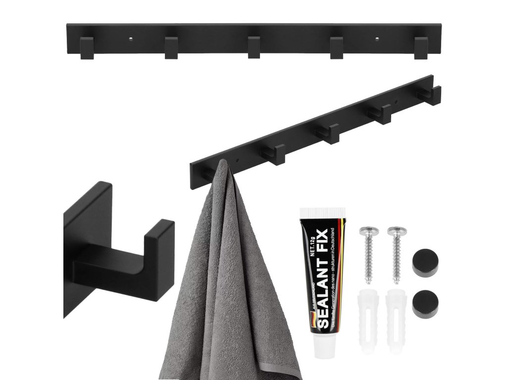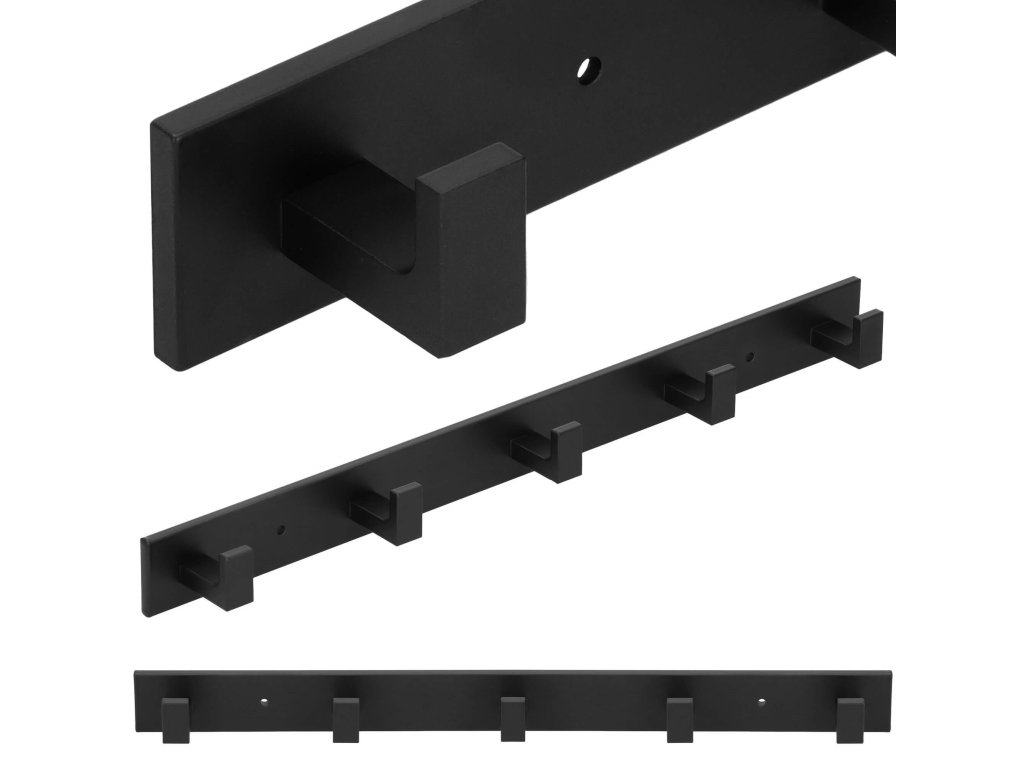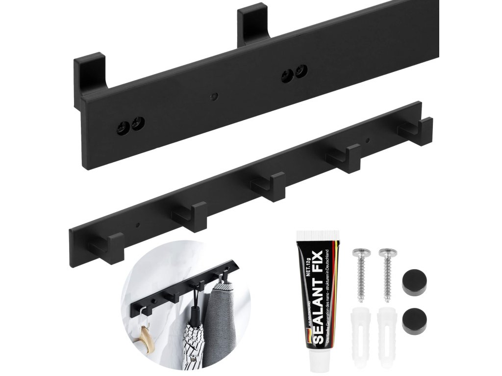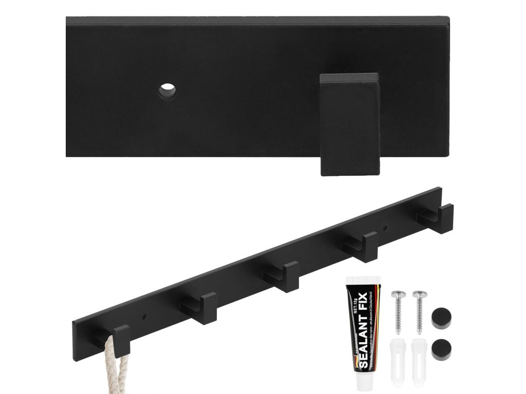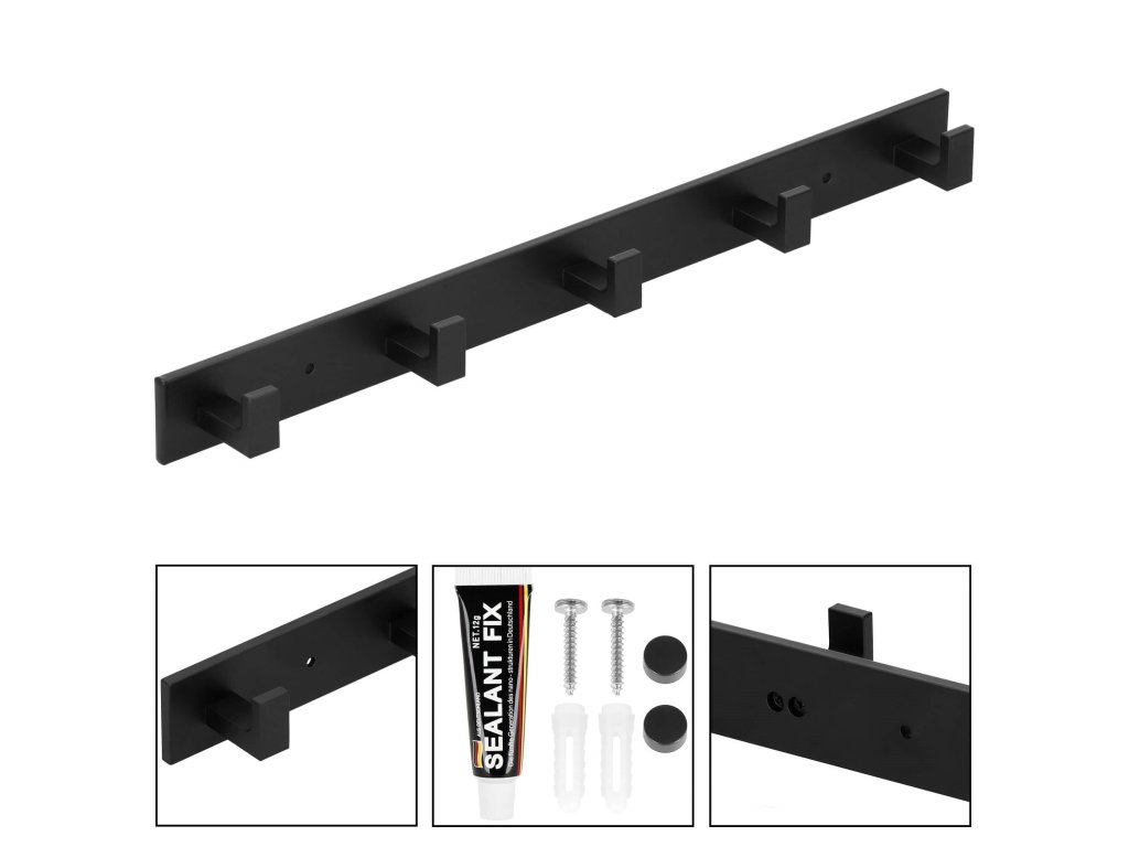 - Sada obsahuje: věšák, lepidlo, 2 šrouby (délka 28 mm), 2 černé krytky, samolepky užitečné při montáži na lepidlo