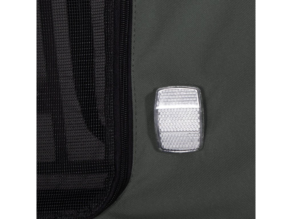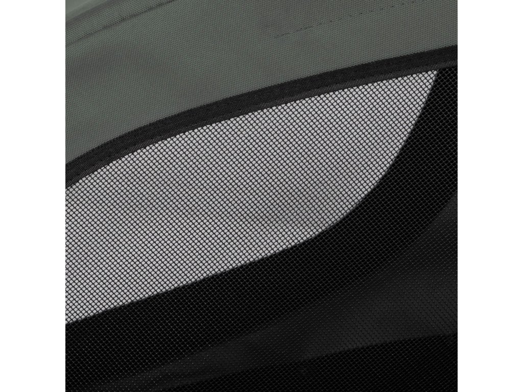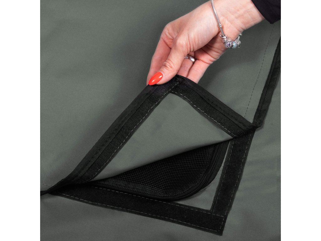 - Vozík má dva vstupy - vzadu a vpředu; zadní klapka je vyrobena z tkaniny a uzavírána na zip, zatímco přední klapka je dvojitá - vnitřní z průhledné sítě (uzavírána na zip) + vnější z průhledné nepromokavé fólie (uzavírána na suchý zip), vnější klapka lze srolovat a upevnit nahoře pomocí dvou našitých gumiček