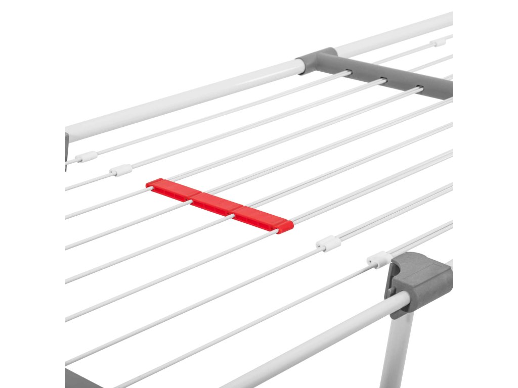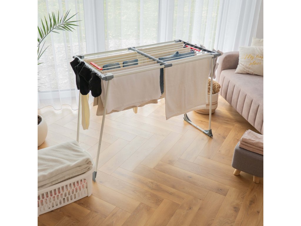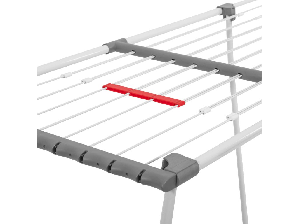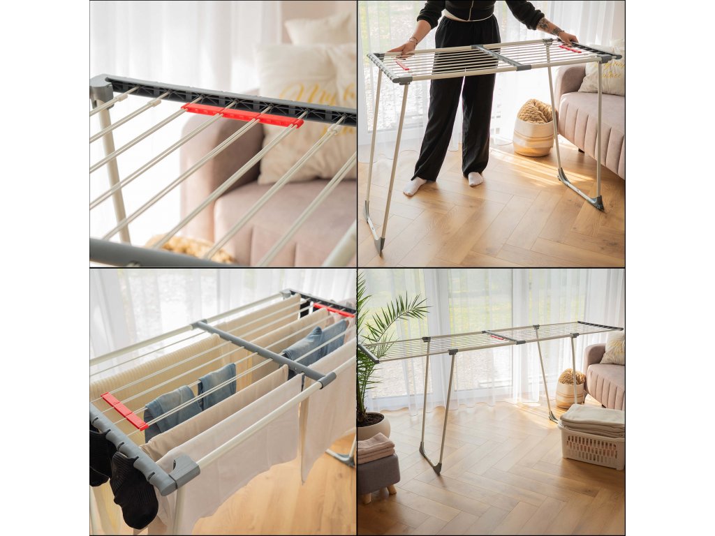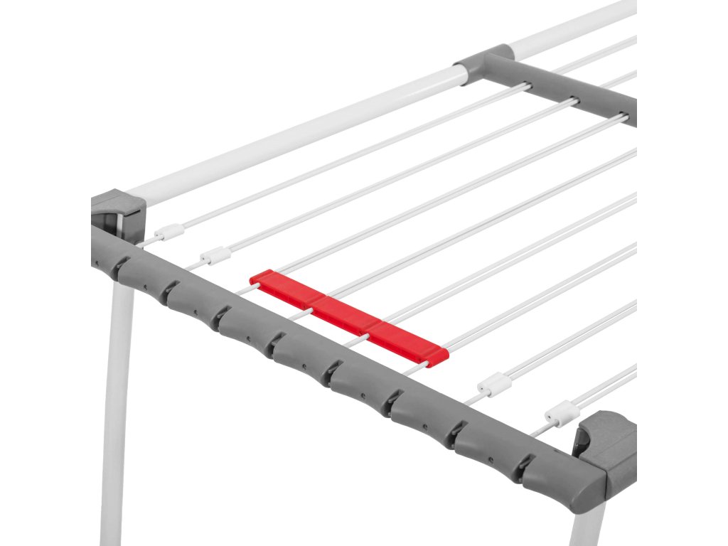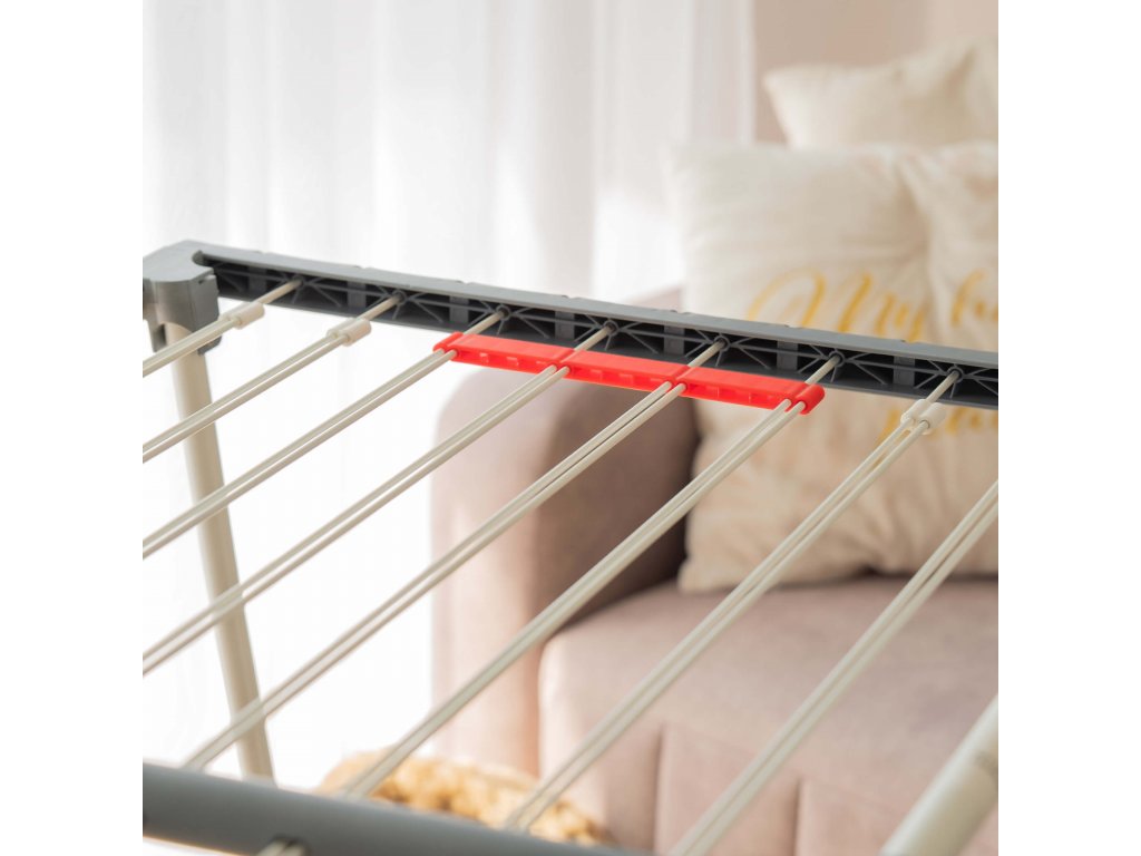- Boční prvky konstrukce mají drážky, do kterých lze zaháknout drobné části sušeného prádla.