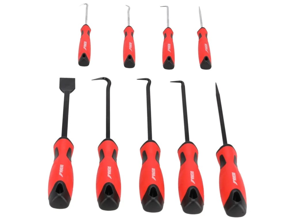 Sada obsahuje devět nástrojů s různými délkami a koncovkami, což umožňuje jejich univerzální využití v různých úlohách. Najdeme v ní mimo jiné škrabku, která usnadňuje odstraňování starých nebo nežádoucích povlaků, jako jsou barvy nebo rez, a také hrot, užitečný např. při přesných montážních pracích.