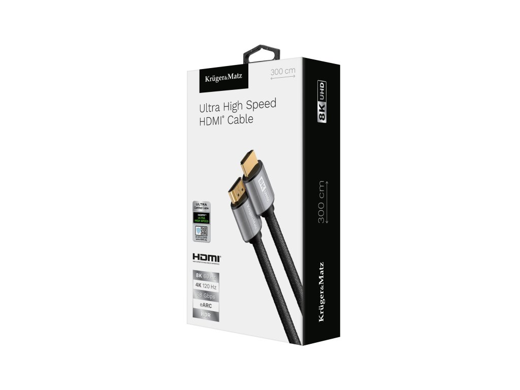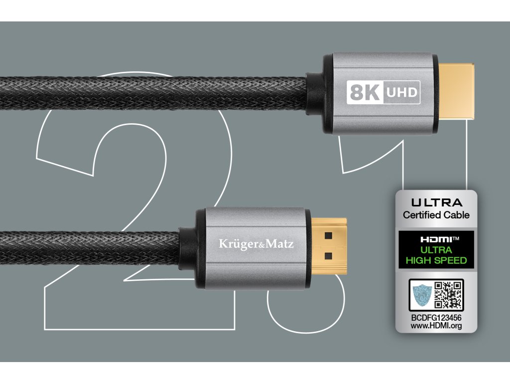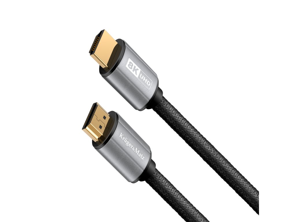 Nyní uvidíte každý detail! HDMI kabel 2.1 Kruger&Matz umožňuje zobrazení obrazu v rozlišeních 8K při 60 Hz a 4K při 120 Hz. Přeneste se na zcela jinou úroveň zážitků při sledování filmů a hraní her na konzoli.