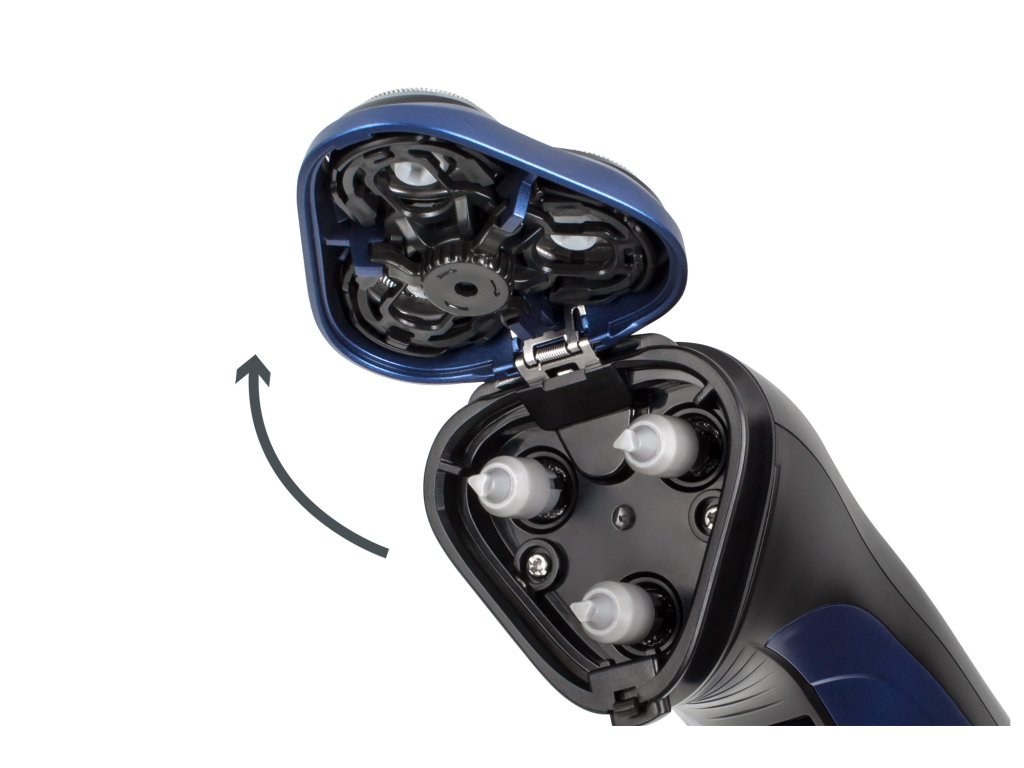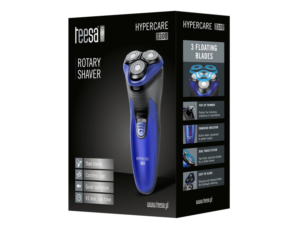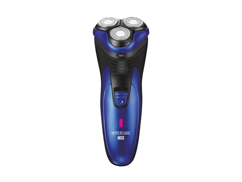 Rotační holicí strojek HYPERCARE T300 je vybaven třemi flexibilními ocelovými břity. Jejich speciální konstrukce a rychlost až 6000 otáček za minutu zaručují dokonalé přizpůsobení se tvaru tváře a krku a rychlé a precizní odstranění vousů.