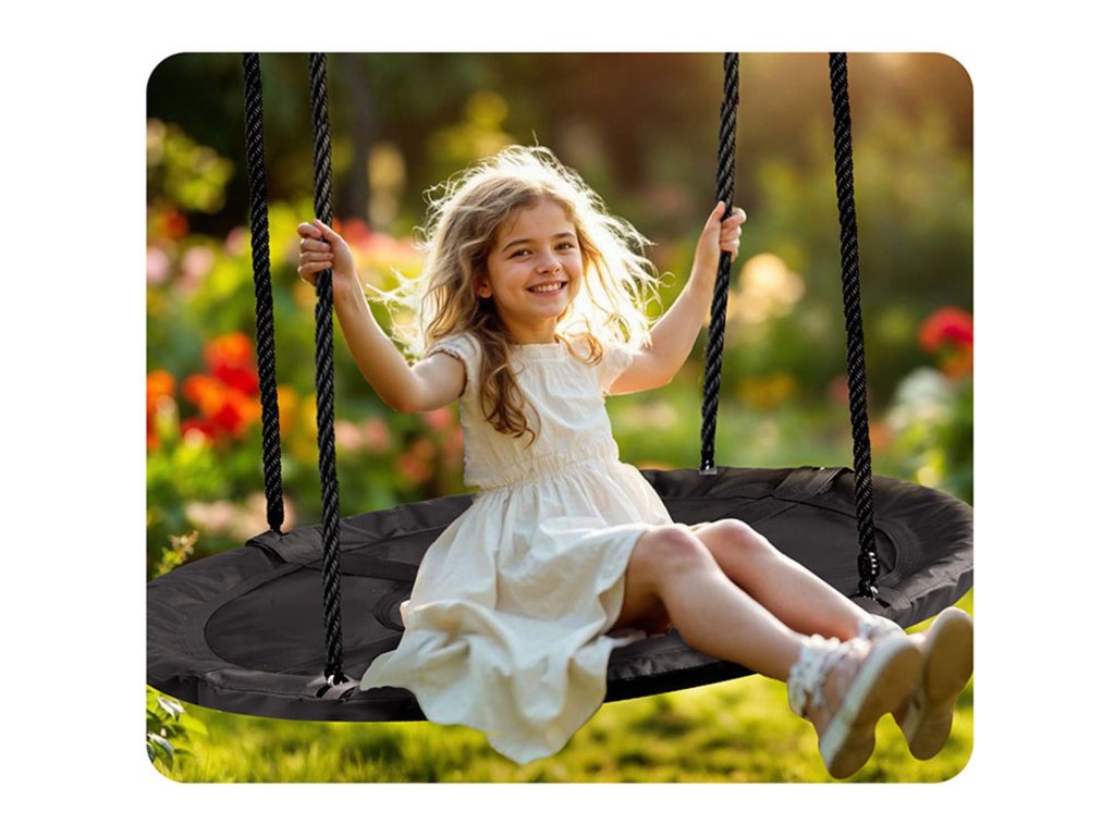 Houpačka na ocelovém rámu pokrytém měkkou ochrannou pěnou PE s více švy a silnými závěsnými lany. Zajišťuje bezpečnost, stabilitu a trvanlivost.