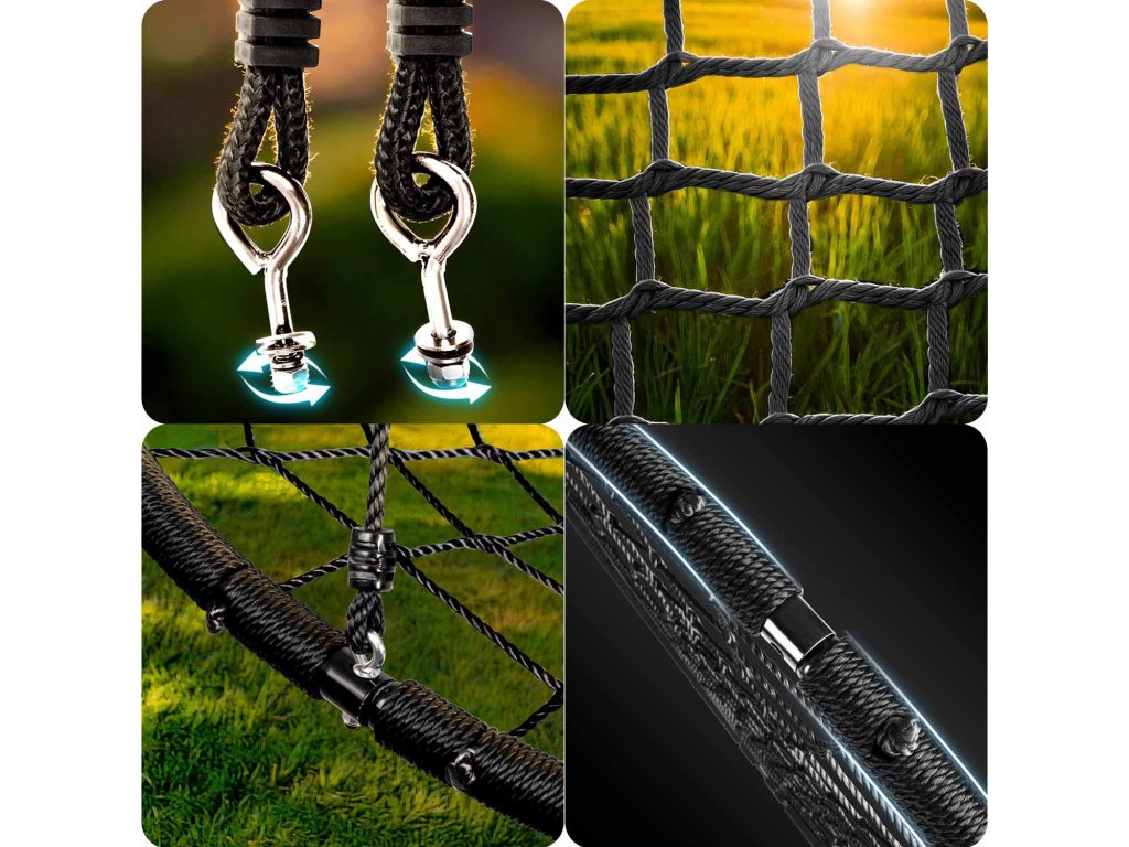 Houpačka na ocelovém rámu pokrytém ochranným opletením, ze silného lana s pletivem pavoučí sítě a tlustými závěsnými lany. Zajišťuje bezpečnost, stabilitu a trvanlivost.