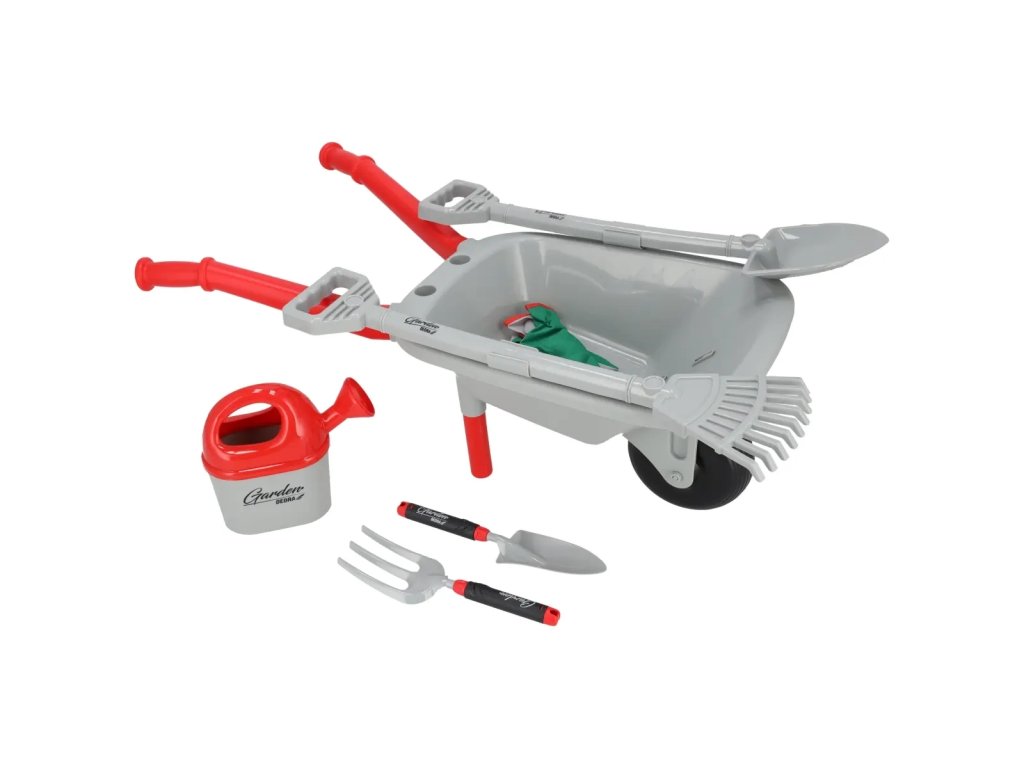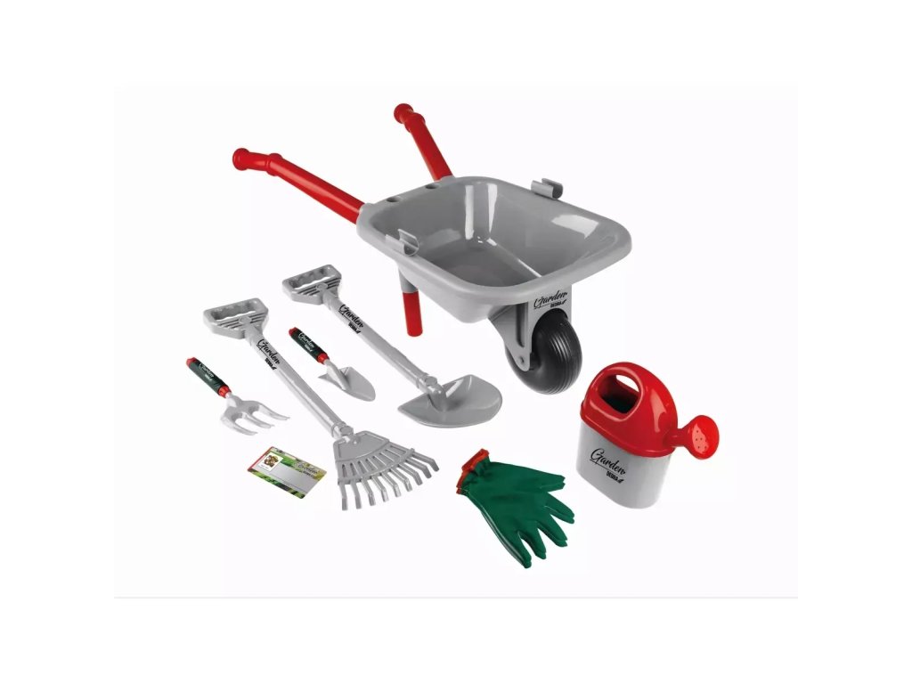 V sadě se nachází kolečko, lopata, hrábě, malé hrábě, malá lopatka, konvička, dětské rukavice a papírová vizitka - celý tento set způsobuje, že naše ratolest se může cítit jako opravdový zahradník!