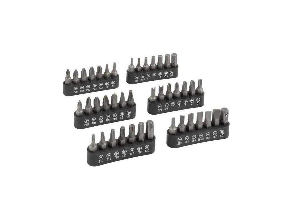 - Sada bitů 42 ks, délka 25 mm: PH0, PH1, PH2, PH2, PH3; SP4, SP6; Y1-Y2-Y3-Y4; C1; T10, T15, T20, T25, T27, T30, T40; SL3, SL4, SL5, SL5.5, SL6, SL7; PZ0, PZ1, PZ2, PZ2, PZ3, S0, S1, S2, S3; H2, H2,5, H3, H4, H5, H5,5, H6mm; AD (adaptér pro hlavice 1/4 ")