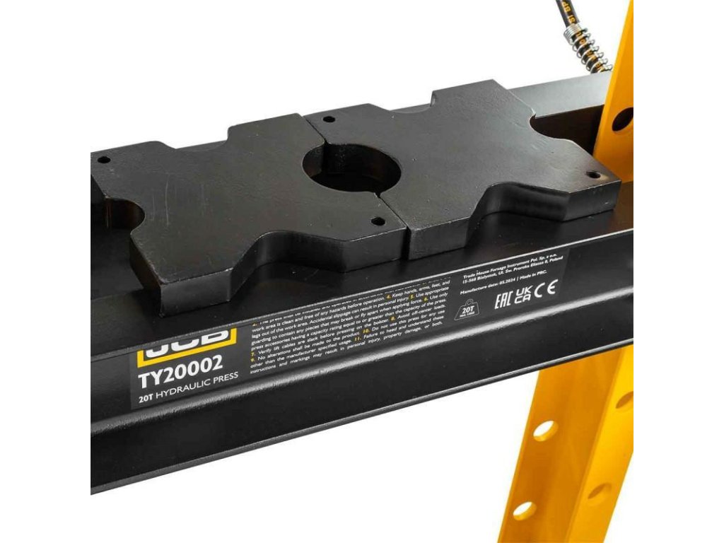 Díky masivní ocelové konstrukci a hmotnosti až 101 kg, zařízení je mimořádně stabilní a odolné proti přetížení. Vestavěný manometr zajišťuje stálou kontrolu nad úrovní tlaku, což je klíčové pro bezpečnost a přesnost.