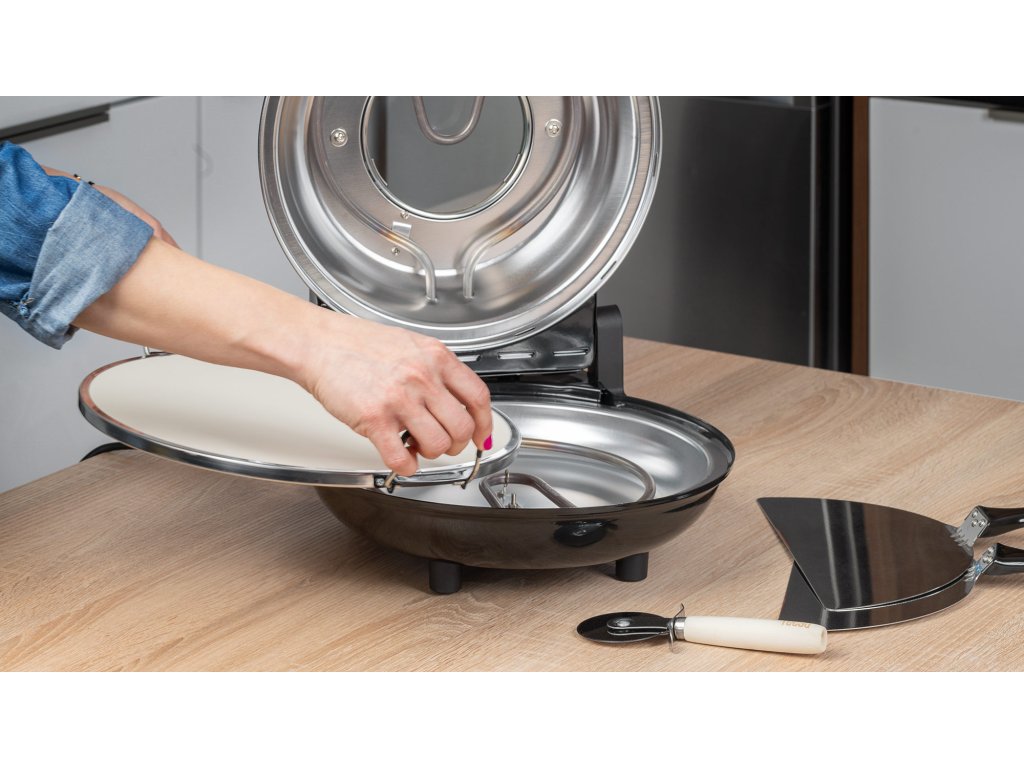 Proto pokud se kámen ve vaší peci na pizzu Teesa s okénkem opotřebuje, můžete si pořídit nový, ideálně přizpůsobený tomuto modelu. Snadnou a bezpečnou výměnu kamene zajišťují dva kovové úchyty, pokryté ochrannou vrstvou proti popáleninám.