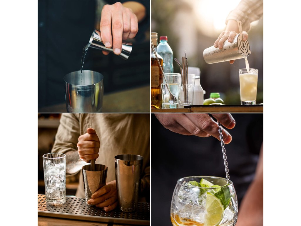 - 2 x barmanská odměrka (jigger) - 15/30 ml a 25/50 ml (větší odměrka: výška 8 cm, průměr: 4,5 cm a 4 cm; menší odměrka: výška: 6,5 cm, průměr: 4 cm a 3,5 cm