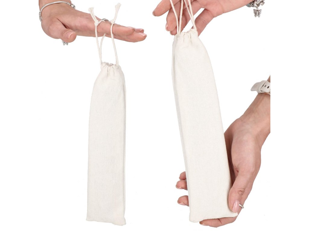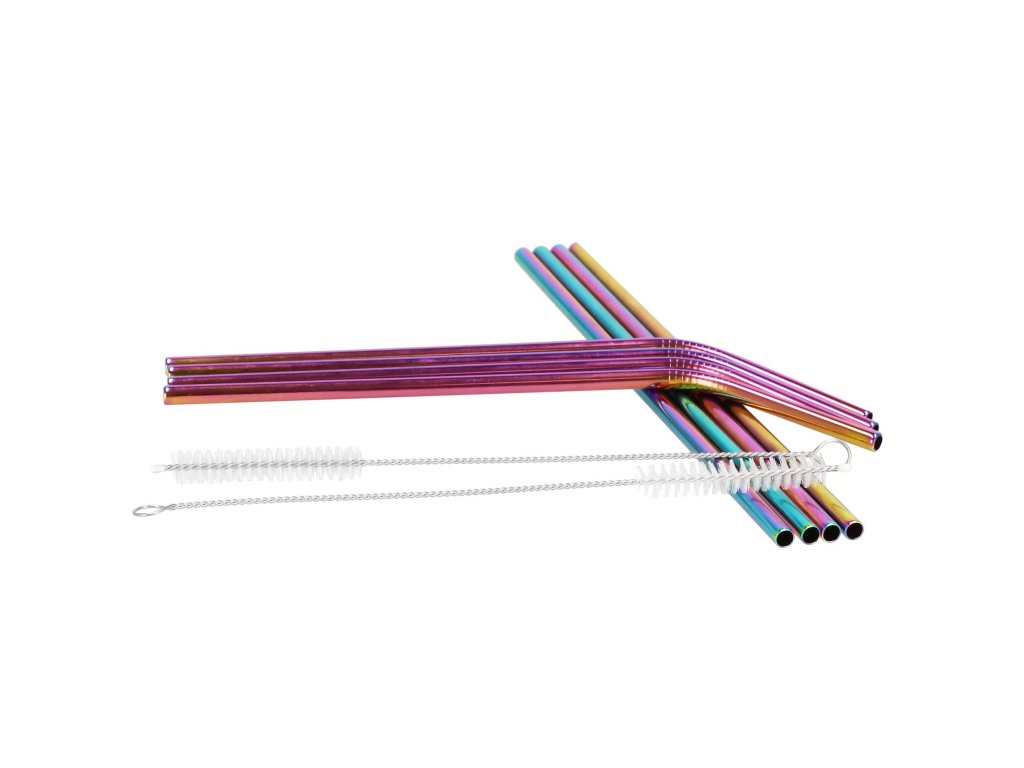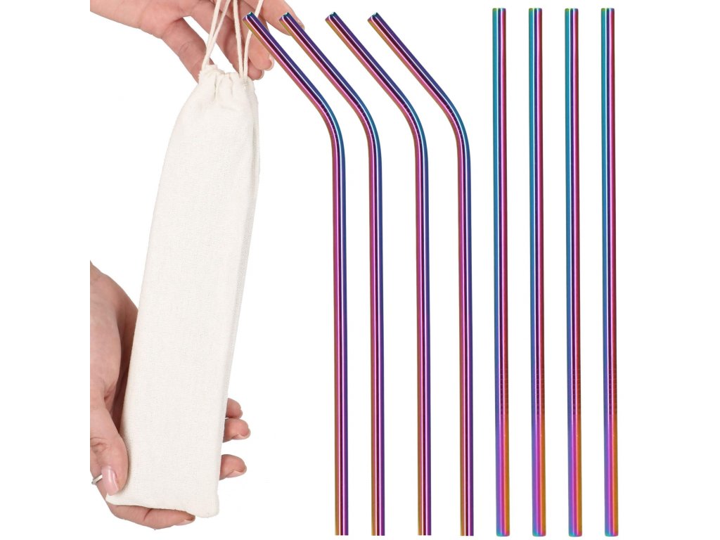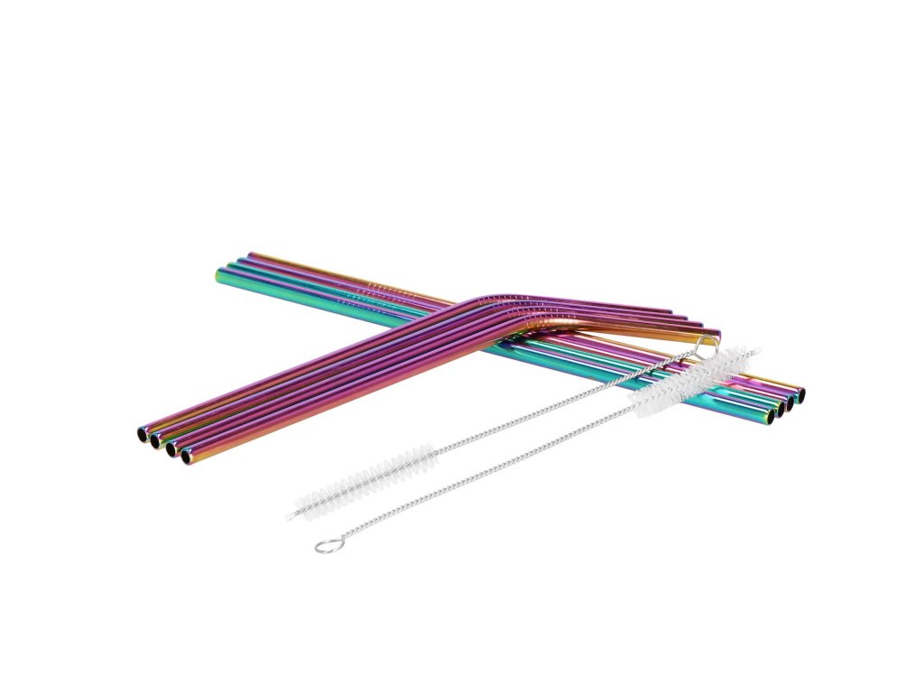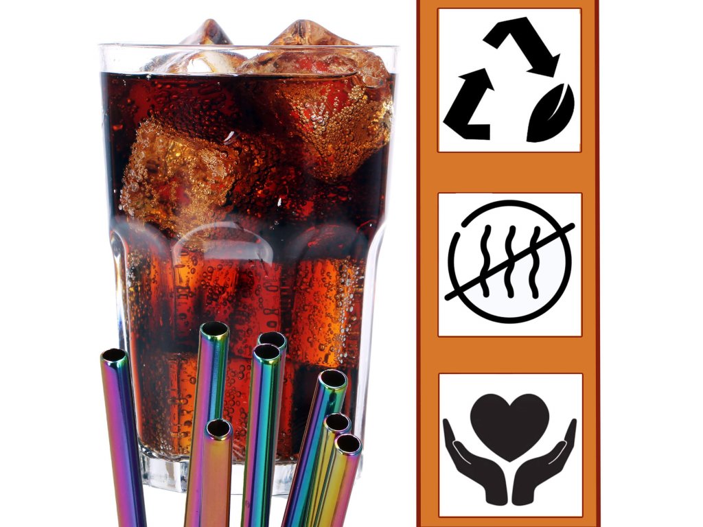 Sada barevných brček na nápoje se štětcem na čištění a plátěným obalem.
