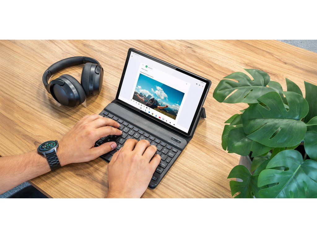 Integrovaná klávesnice se připojuje k tabletu pomocí technologie Bluetooth 5.0, což nabízí stabilní připojení až do 10 metrů. Magnetické upevnění umožňuje snadné odpojení klávesnice, pokud je to potřeba, a zajišťuje flexibilitu při používání. Je to ideální nástroj pro psaní e-mailů, poznámek nebo dokumentů.