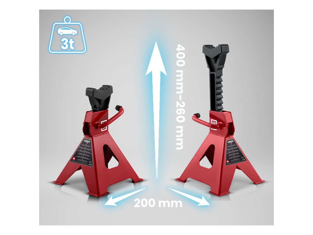 Zvedáky jsou vybaveny pohodlným zámkovým mechanismem, který umožňuje rychlé a bezpečné nastavení výšky v rozmezí od 260 mm do 400 mm. Díky tomu snadno nastavíš vozidlo na správnou úroveň – bez složité manipulace a ztráty času.