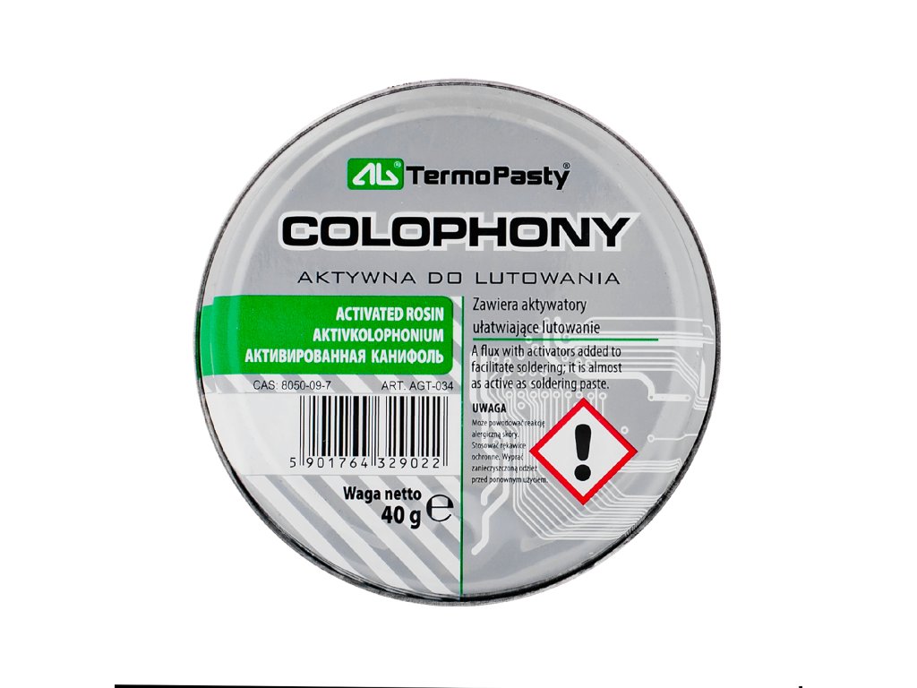 Použití: • velmi dobrý tavidlo při pájení cín-olovnatou slitinou • používá se k natírání vlasů smyčcových nástrojů za účelem zvýšení drsnosti a tím i zvýšení jejich přilnavosti k strunám • jako pojivo v polygrafických barvách, které zároveň zlepšuje jejich vlastnostiPoužití:
