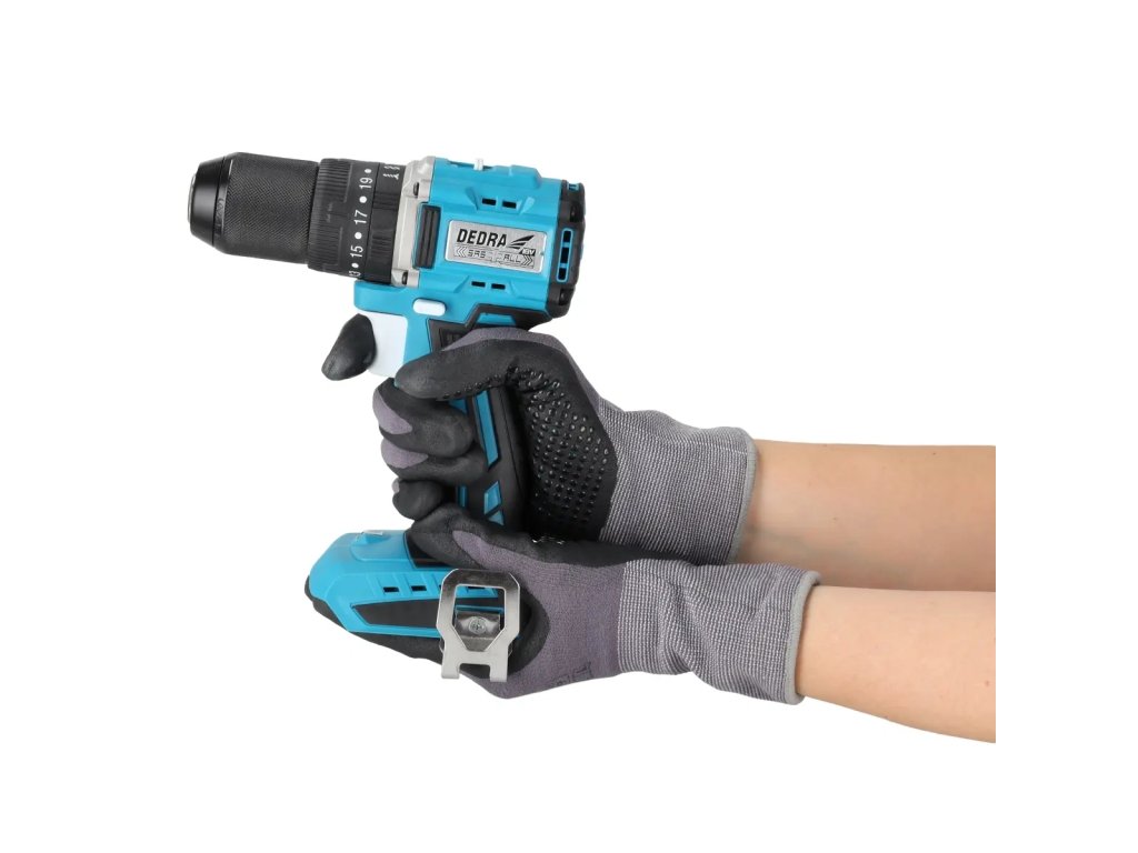 Pomocí této vrtačky, jejíž točivý moment činí 50Nm, si skvěle poradíme se šroubováním a vrtáním do takových materiálů, jako je dřevo, kov, plasty. Kryt byl vyroben z nylonu s přídavkem skleněných vláken, díky čemuž se zvýšila odolnost proti mechanickému poškození a UV záření. Ergonomii a komfort práce zlepšují: malá hmotnost zařízení a pogumovaná rukojeť. Další LED osvětlení zajistí, že přesně vykonáme práci ve špatně osvětlených, těžko přístupných místech.