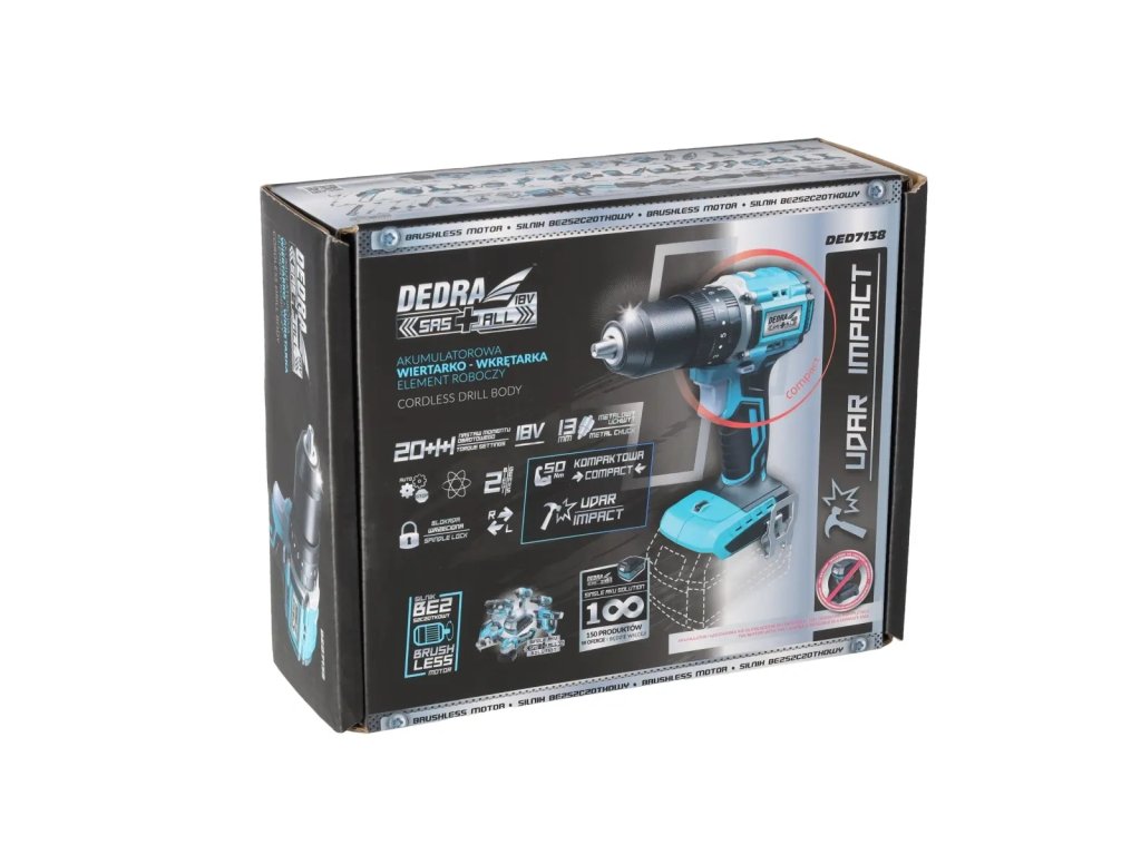 Akumulátorová vrtačka-skrutkovač, bezkartáčová vrtací šroubovák s rázem 18V, DEDRA SAS+ALL DED7138: