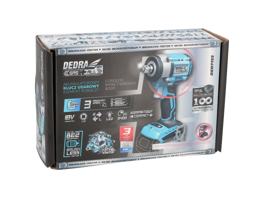 Kompaktní bezkartáčový akumulátorový rázový klíč DEDRA DED7153 350Nm 1/2", 18V