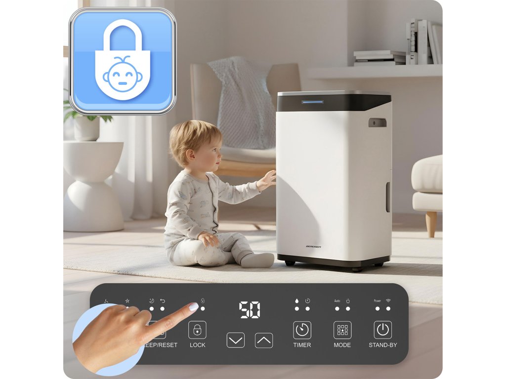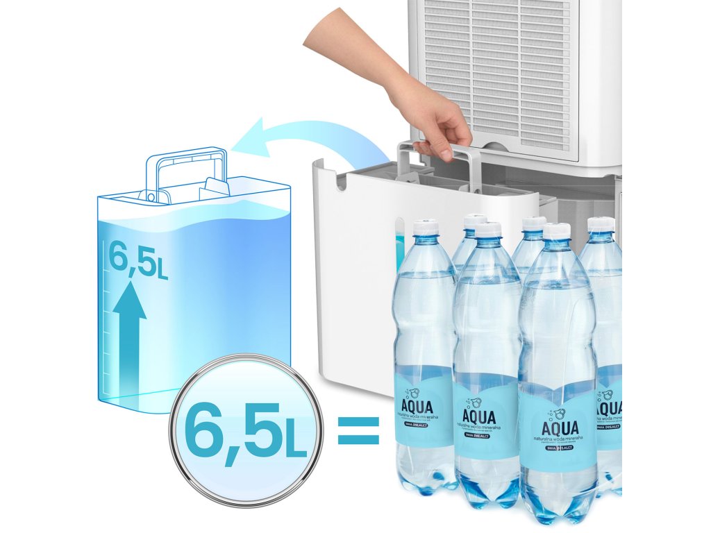 - Zkracuje čas sušení oděvů – odvlhčovač intenzivně odvlhčuje vzduch, čímž urychluje přirozený proces odpařování vlhkosti z prádla.
