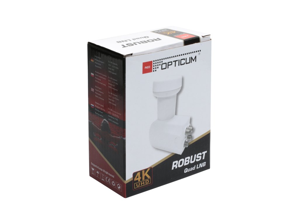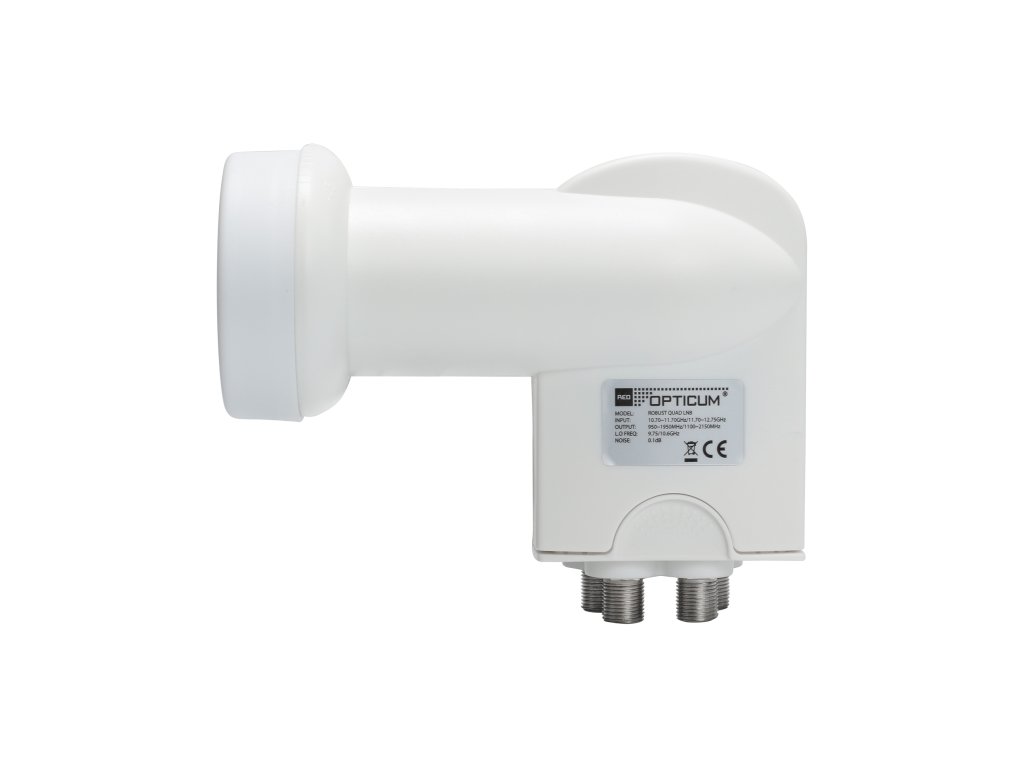 Satelitní konvertor OPTICUM ROBUST typu Quad se vyznačuje velmi nízkým šumovým číslem rovným 0,1 dB, což ho řadí do nejužší špičky mezi konvertory dostupnými na trhu. Konvertor je určen k práci se čtyřmi tunery nebo se dvěma dvouhlavými atd. Precizní zpracování a vysoké technické parametry se prakticky promítají do menšího vlivu atmosférických podmínek na kvalitu přijímaného signálu. Technické údaje: - Šumové číslo: 0,1 dB - Polarizace: lineární H/V - Frekvenční rozsah: od 10,7 GHz do 12,75 GHz - Průměr držáku 40 mm - Ochrana proti vodě: 100% testovánoSatelitní konvertor OPTICUM ROBUST typu Quad se vyznačuje velmi nízkým šumovým číslem rovným 0,1 dB, což ho řadí do nejužší špičky