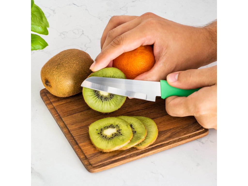 Nôž na zeleninu a ovocie Teesa je jedným zo základných doplnkov, ktoré by nemali chýbať v žiadnej kuchyni. Špeciálny tvar čepele uľahčuje lúpanie a krájanie ovocia, zemiakov a inej zeleniny. Ľahký a praktický nôž perfektne padne do ruky a uľahčuje krájanie byliniek alebo cibule. Vďaka svojej veľkosti bude veľmi užitočný aj pri zbieraní a následnom čistení húb.