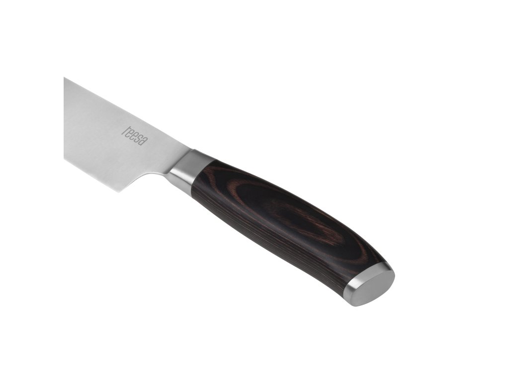 Kuchařský nůž Teesa je vyroben z vysoce kvalitní nerezové oceli, díky čemuž vyniká vysokou odolností, ostrostí a odolností proti korozi. Můžete si být jisti, že toto příslušenství vám bude sloužit po mnoho let. Všimněte si také ergonomické rukojeti, která zajišťuje, že je nůž velmi pohodlný a bezpečně sedí v ruce.