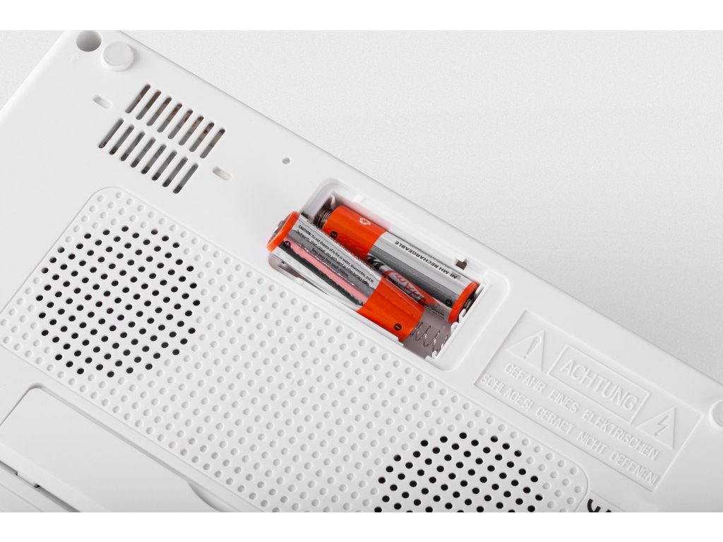 Napájení bateriemi: 2x baterie AA (nejsou součástí balení; napájení bateriemi slouží pouze k udržení paměti hodin a budíku při výpadku proudu)