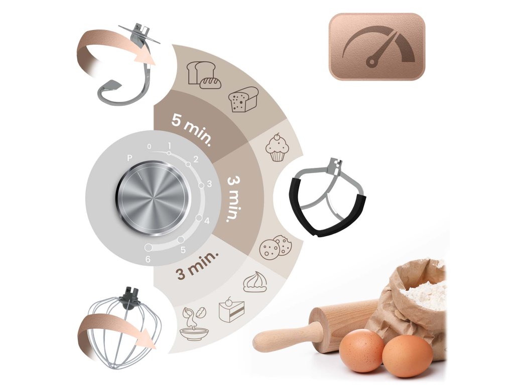 Hák na hnětení těsta nejlépe funguje na rychlostech 1–3, míchač na krémy a náplně pracuje optimálně při nastaveních 2–4, a metla na šlehání a šlehačku rozvine plnou kapacitu při rychlostech 5–6 – vždy ideální konzistence, bez kompromisů.