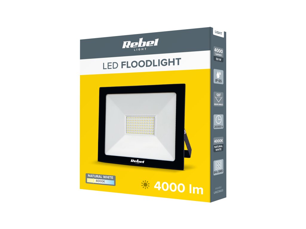 Reflektor LED Rebel o výkonu 50 W je vybaven 84 diodami typu 2835 SMD, které emitují jasné, přirozené světlo s barevnou teplotou 4000 K. Díky světelnému toku až 4000 lumenů a vysoké světelné účinnosti 80 lm/W reflektor zajišťuje výborné osvětlení se širokým úhlem svícení 120°.