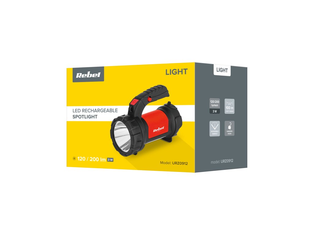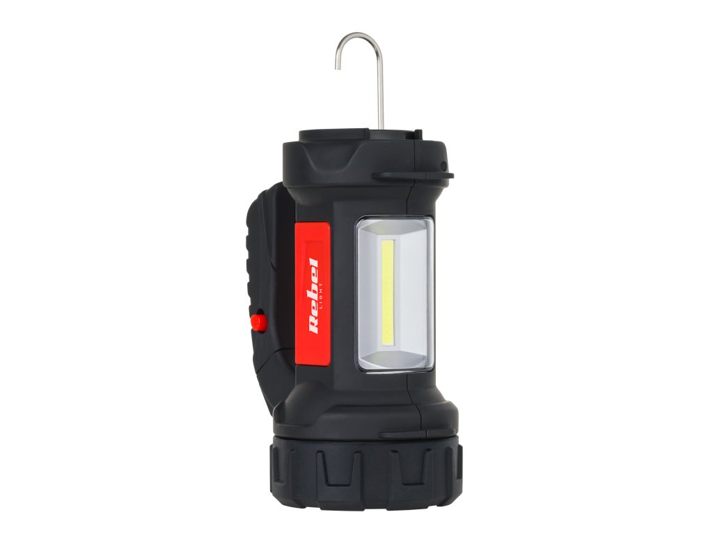 LED akumulátorová svítilna reflektor 3W 120lm 100m + COB 200lm 200m hák Rebel