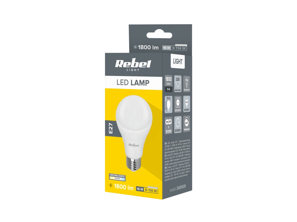 LED žárovka s výkonem 16 W a 1800 lm ze série Rebel je zárukou vysoké účinnosti a nízké spotřeby energie. Vyznačuje se dlouhou životností a širokým 220stupňovým úhlem svícení v přirozené barvě. LED lampa značky Rebel se řadí do energetické třídy E a je v souladu s posledními nařízeními Evropské komise týkajícími se energetického štítkování světelných zdrojů a požadavků na ekodesign světelných zdrojů.