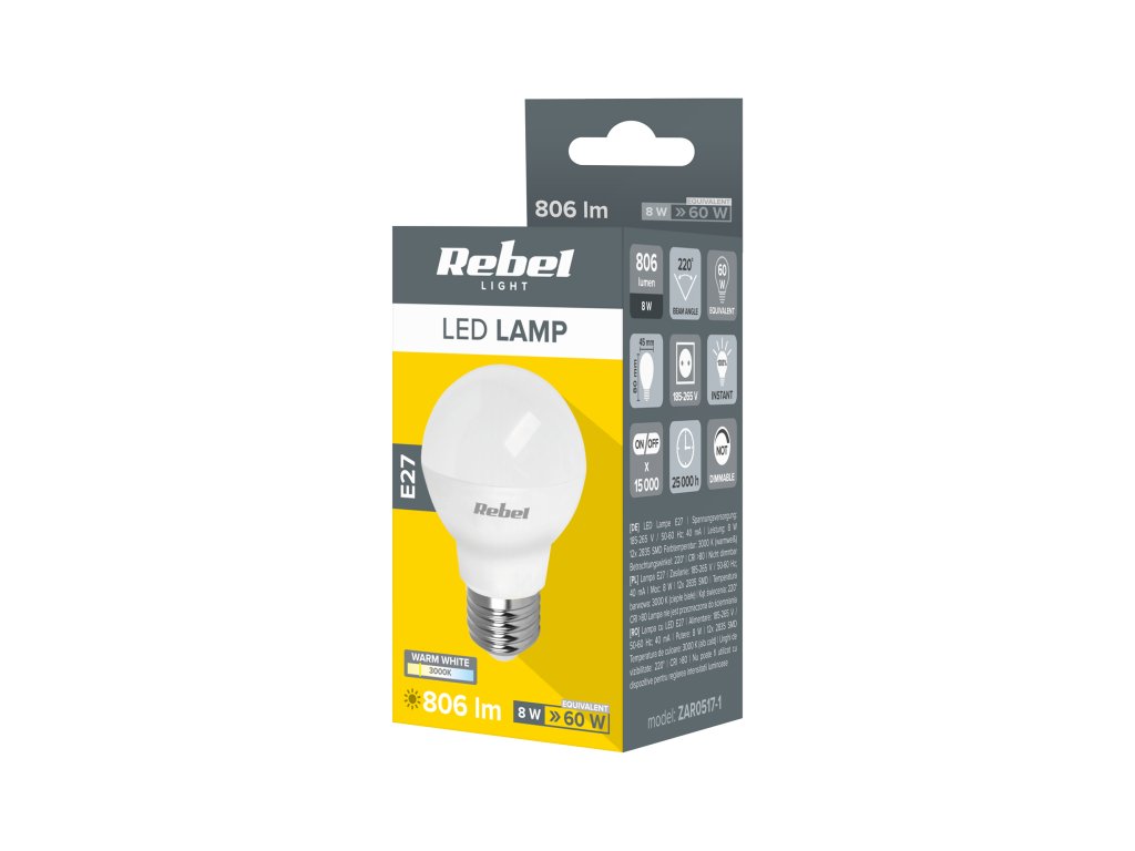 LED lampa Rebel o výkonu 8W a tvaru G45 je energeticky úsporný zdroj světla, ideální do svítidel s paticí E27. Vyzařuje teplé bílé světlo o teplotě 3000K, vytváří útulnou atmosféru v každé místnosti.