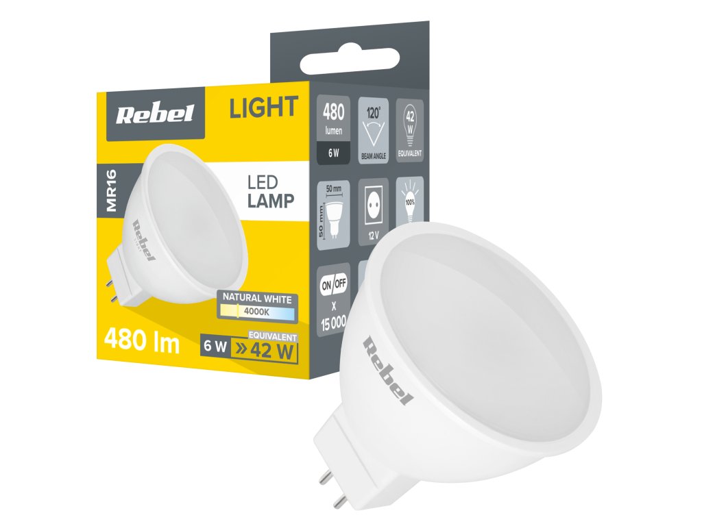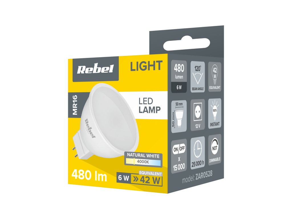 LED lampa Rebel o výkonu 6W s paticí MR16 je efektivní zdroj světla, který se skvěle hodí do svítidel typu reflektor. Vyzařující přirozené bílé světlo s teplotou 4000K, tato lampa poskytuje jasné a příjemné osvětlení ideální pro různé místnosti.