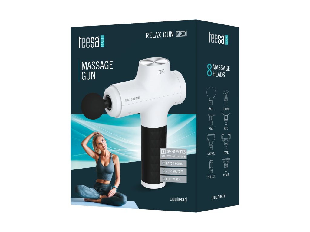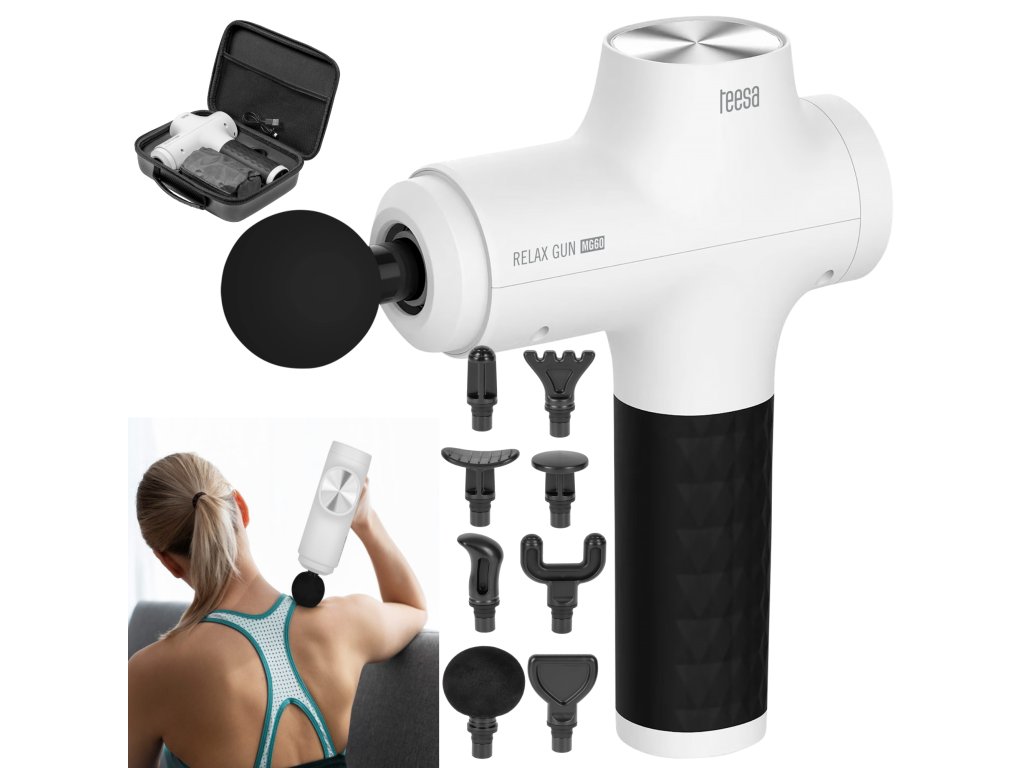 Masážní pistole TEESA RELAX GUN MG60, 8 nástavců, bílá