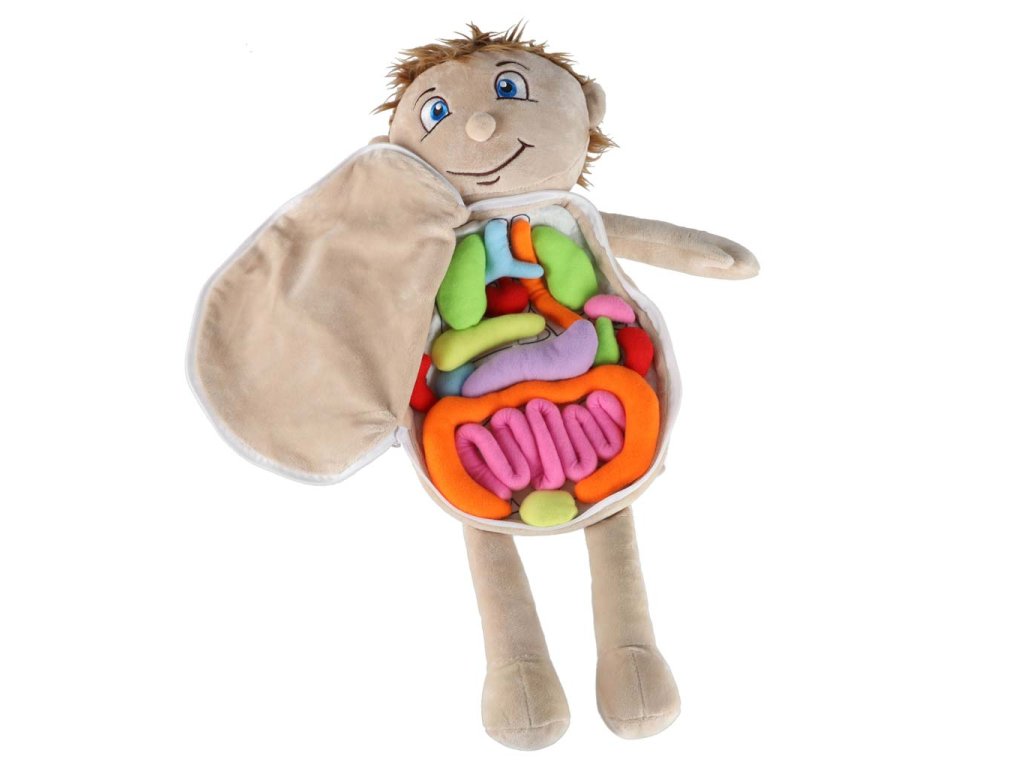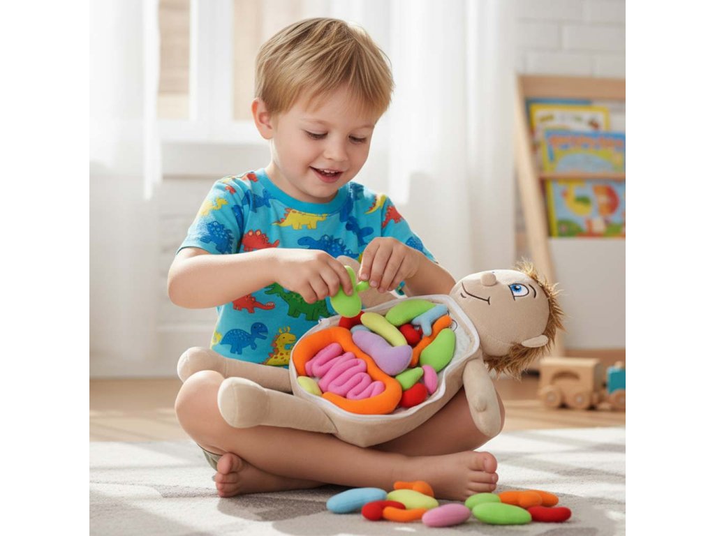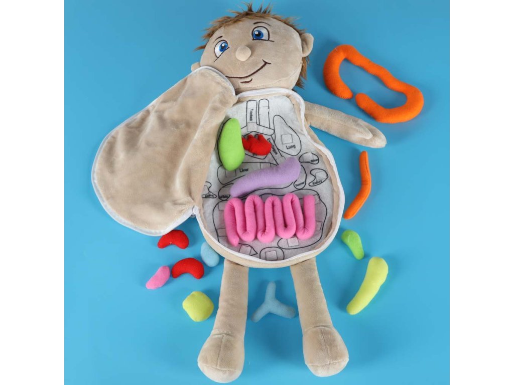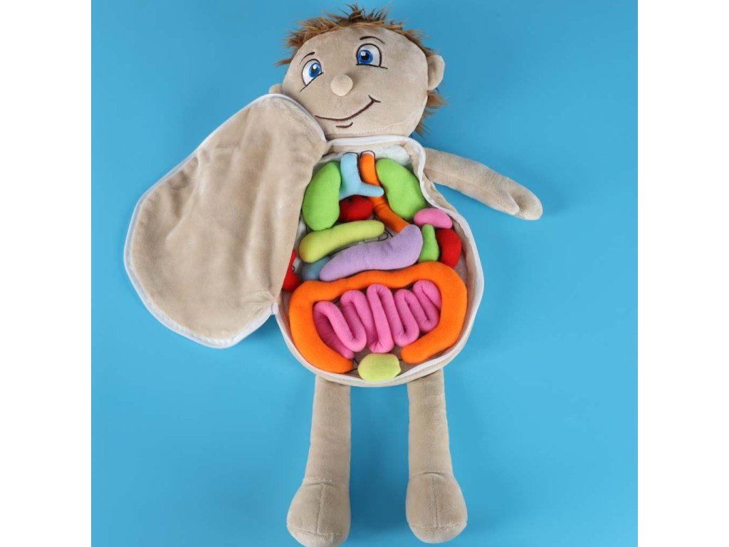 Vzdělávací panenka s odnímatelným bříškem je jedinečná hračka, která pomáhá dětem přátelským způsobem poznávat stavbu lidského těla. Bříško panenky se dá snadno odepnout díky bezpečnému zipu. Uvnitř se nacházejí měkké, barevné "vnitřnosti" přišité suchým zipem, které může dítě vybrat a přemístit. Každý kus je vyroben z polyesteru příjemného na dotyk, bezpečného pro nejmenší. Panenka je oblečena do barevného zástěry, kterou lze snadno svléknout. Zástěra se vzadu zavazuje na stuhu, díky čemuž se pohodlně obléká a svléká. hračka rozvíjí zvědavost, manuální dovednosti a učí hrou. Ideální do mateřských škol, terapeutických místností a na doma. Vhodná pro děti ve věku 3+.