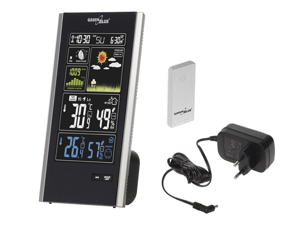 Stacja počasí bezdrátová DCF, tlak, fáze měsíce, nabíječka USB GreenBlue GB520 černá