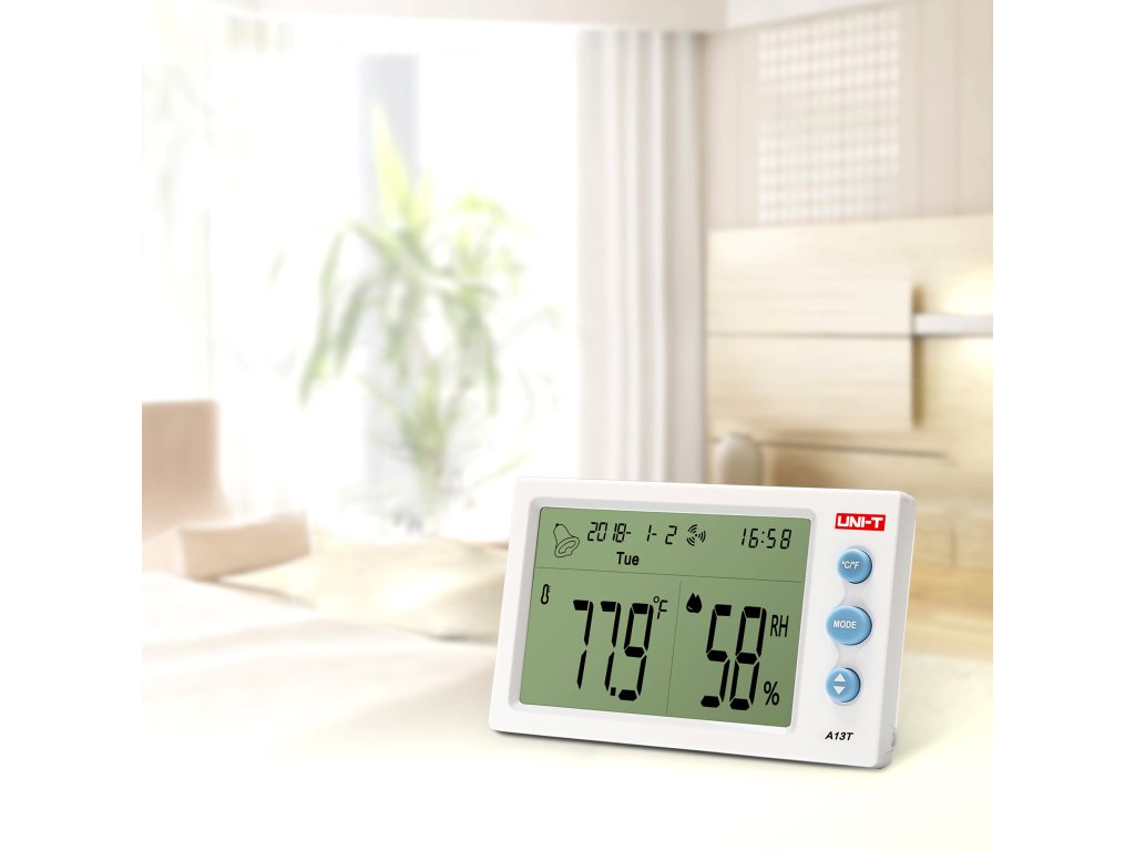 Uni-T A13T nabízí měření teploty v rozmezí od -10°C do 50°C s přesností ±2°C a rozlišením 0,1°C. Uživatelé si mohou vybírat jednotky teploty: °C nebo °F, což umožňuje přizpůsobení odečtů preferencím. Rozsah měření vlhkosti vzduchu je od 20% do 95% RH, s přesností ±5% RH a rozlišením 1%, což umožňuje monitorování atmosférických podmínek s vysokou přesností.