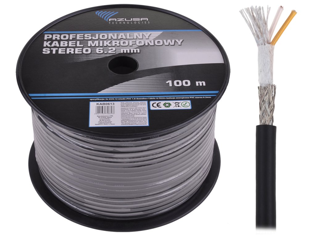 Profesionální mikrofonový kabel značky AZUSA specifikace: 2x 24/0.12 měď + PVC 1.6+bavlna + 120/0.12 TCCA + vnější izolace PVC černá 6.2mm CÍVKA 100mProfesionální mikrofonový kabel značky AZUSA
