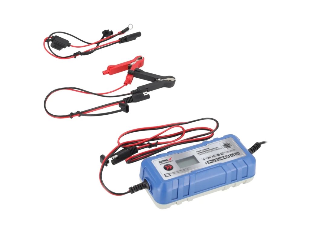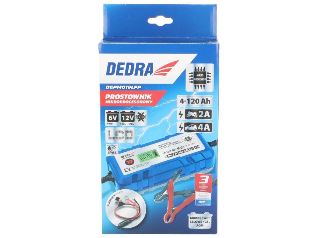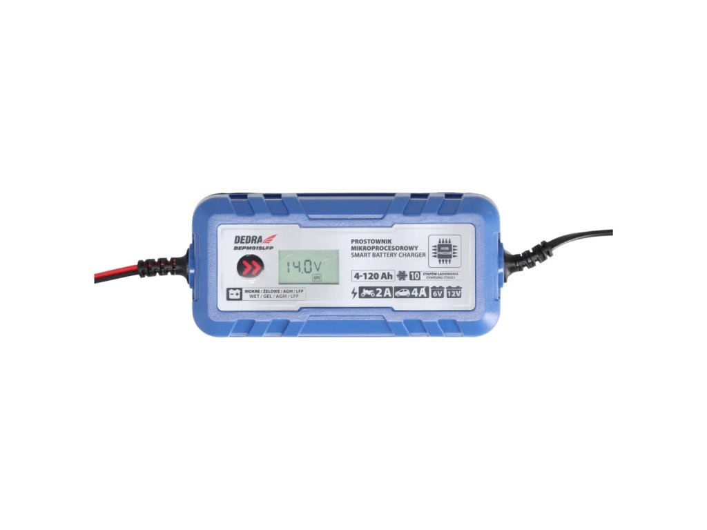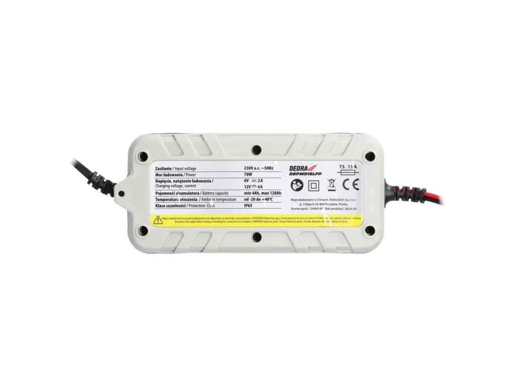 Nabíječka DEPM019LFP je zařízení určeno k nabíjení olověných (mokré), gelových, AGM, LFP akumulátorů s napětím 6/12 V a kapacitou 4-120 Ah, které se používají v motocyklech, automobilech atd.